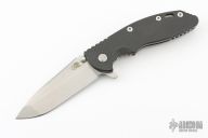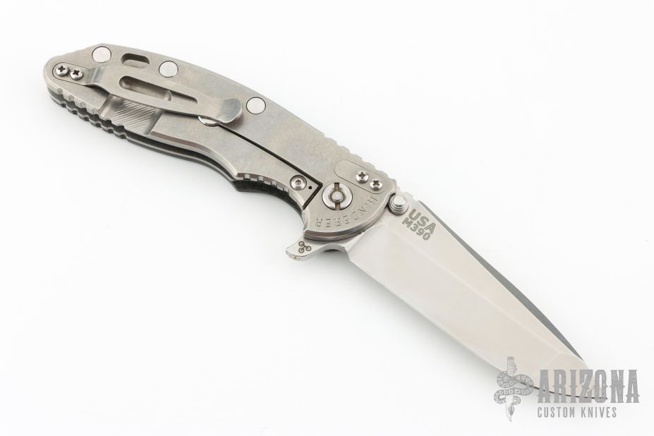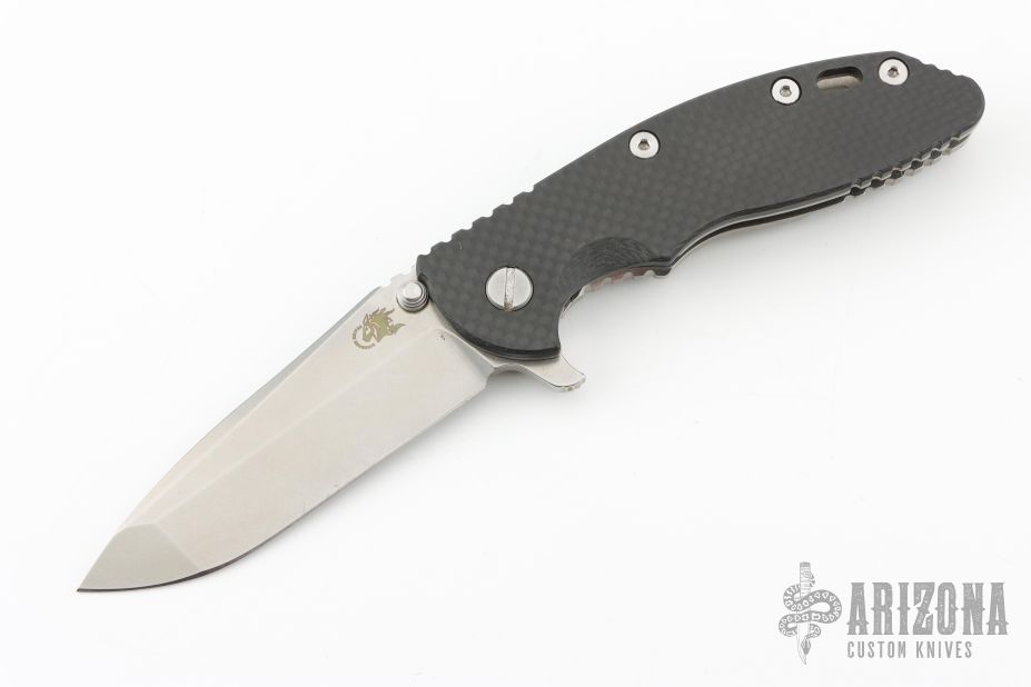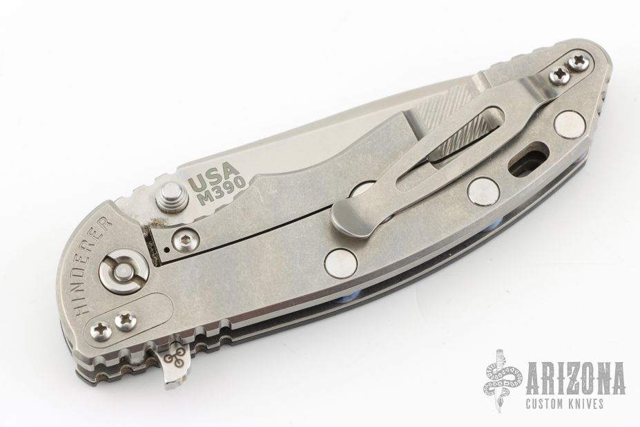 This XM-18 flipper by Hinderer features a stonewashed blade with notched thumbrest and flipper. The handle has a stonewashed titanium frame with carbon fiber scale and filler tab, tip up or down reversible titanium clip. Excellent Condition.