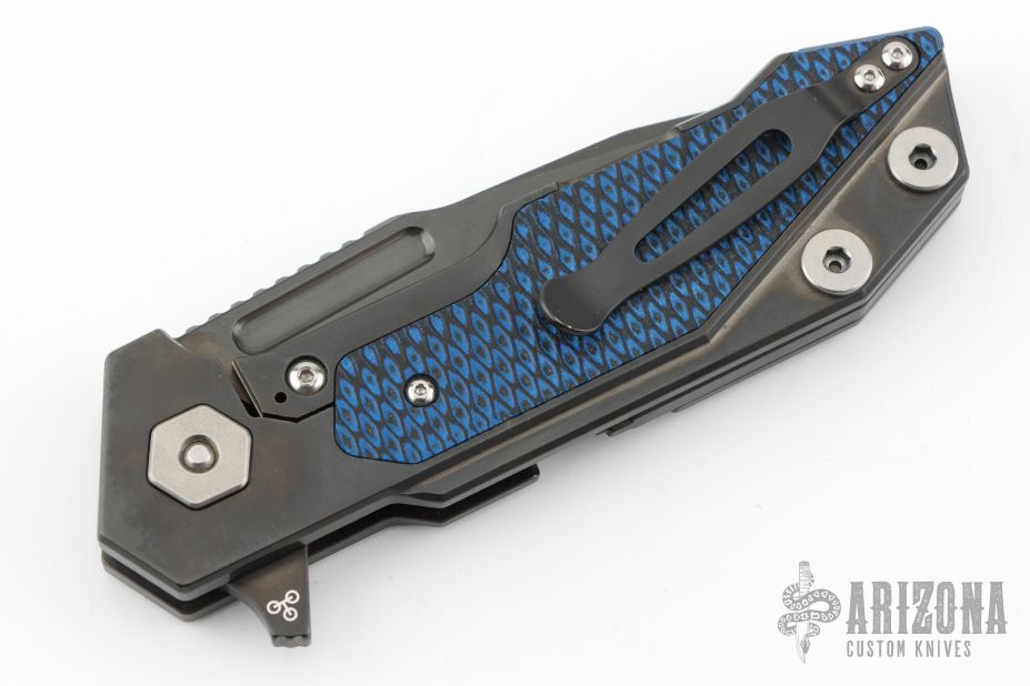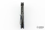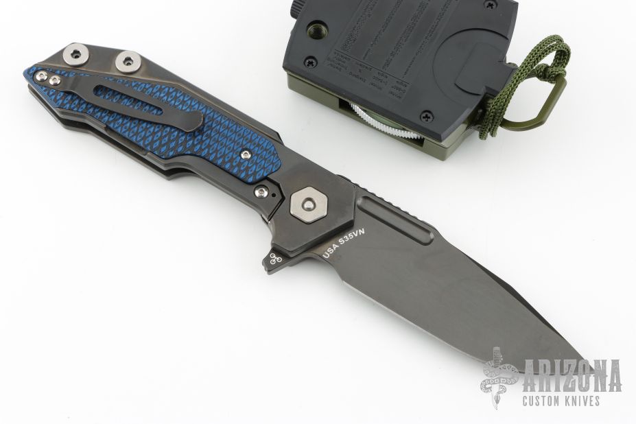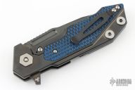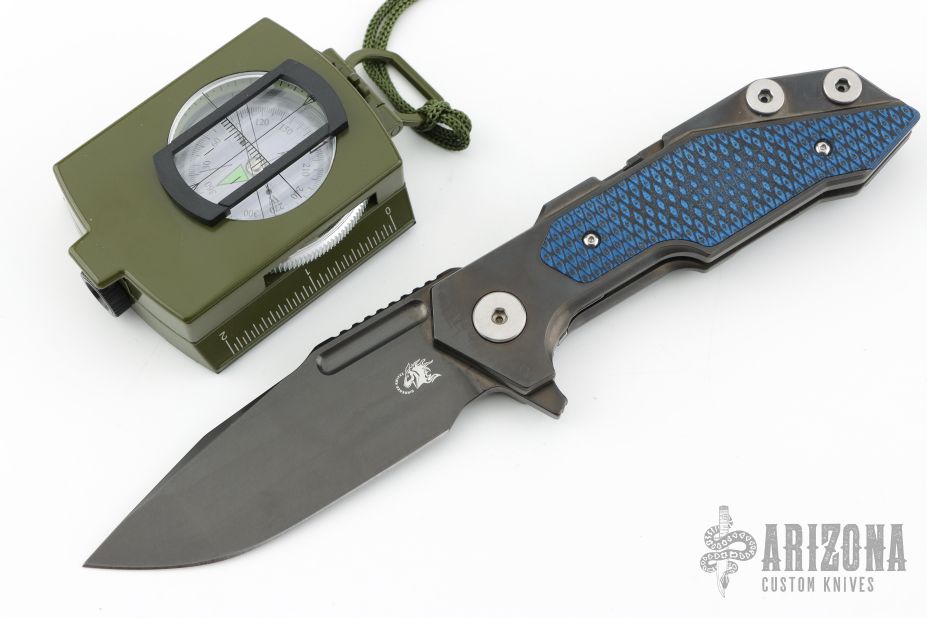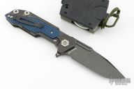 This Fulltrack flipper from Rick Hinderer Knives was just released at the 2018 Blade Show and this is the quite possibly the coolest design we've seen since the XM-18! This one features a black DLC stonewash finished blade with notched thumbrest and flipper. The handle is black DLC stonewash finished titanium with blue/black G-10 scales that can be removed to reveal a hidden pocket/storage area that was designed to hold additional pivot washers. This entire knife can be field stripped using a tool that rests between the handle scales. The tool has a spring that holds the tool between the standoffs. Come with Tri-Pivot system. Comes in original box with extra washers and card. Includes a compass. Excellent condition.
