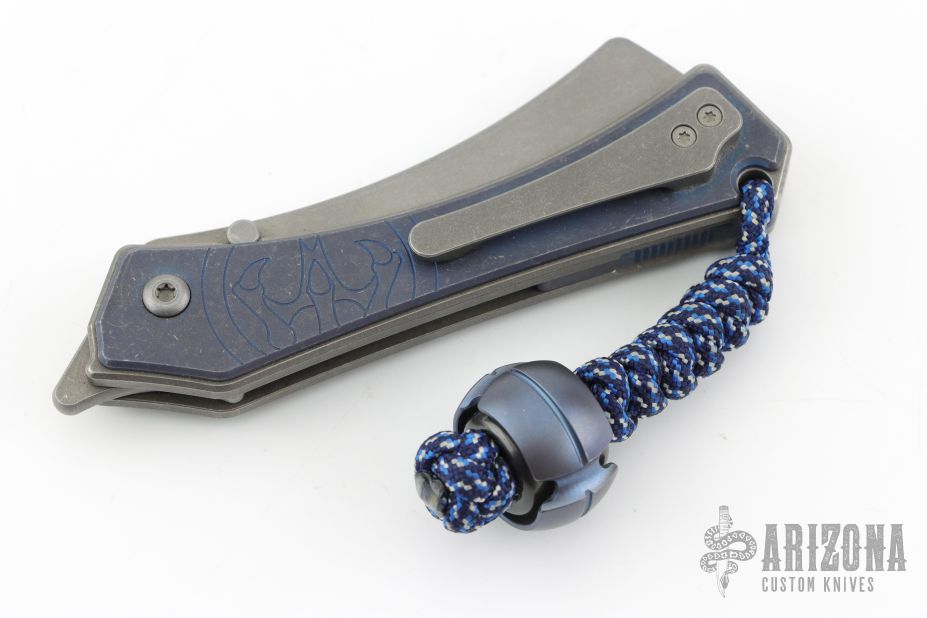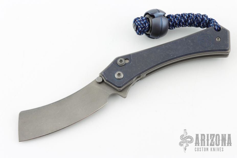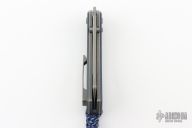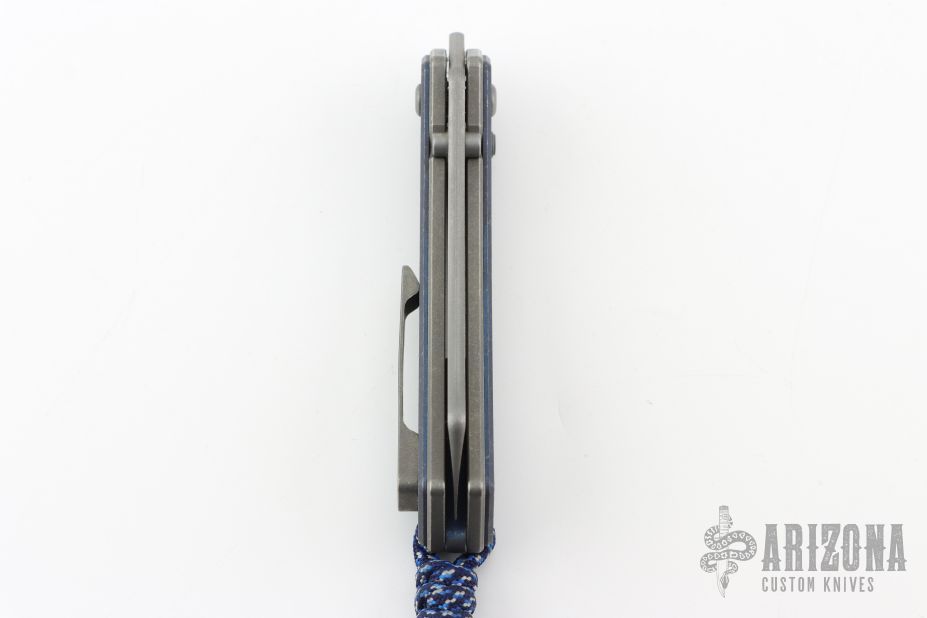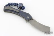 This Orbit is a collaborative effort between G&G Hawk and Serge Panchenko. It features a tumble finished cleaver style blade with front flipper. The handle has an tumbled titanium liners and an anodized titanium scales/backspacer. Tumbled titanium pocket clip is positioned for tip up carry. Panchenko and Hawk logos have been milled into either side of the handle. Lanyard hole in pommel. Excellent condition. As with of of Gavin's mechanisms, this knife has a very cool "Hawk Lock" feature. Excellent Condition.