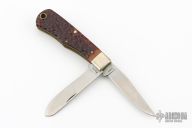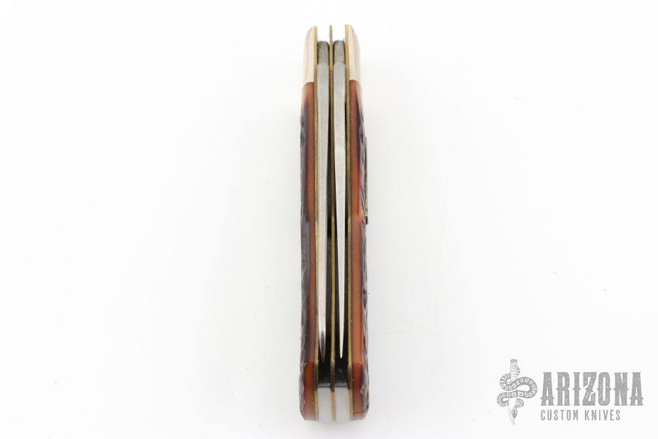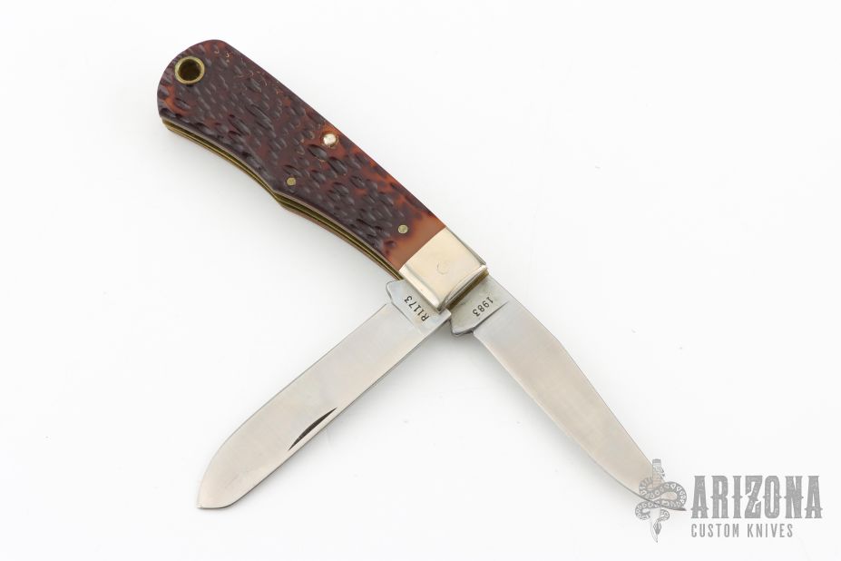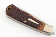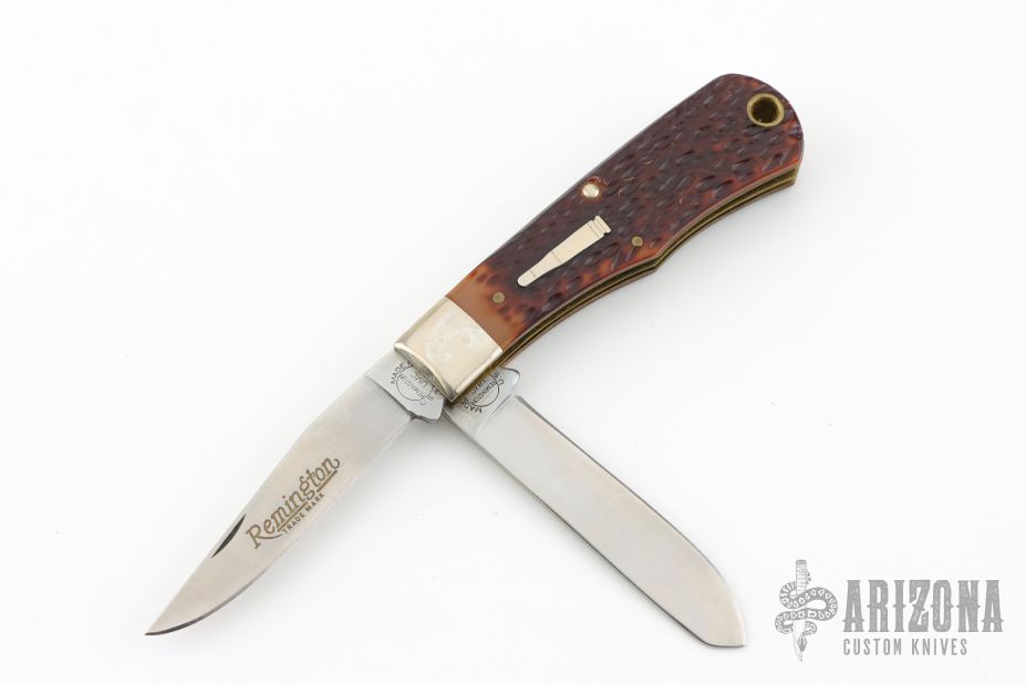 This Bullet Knife by Remmington has two satin finished blades with nail nicks. The handle has nickel silver bolsters, jigged bone covers, brass liners and steel springs. Has some patina. Excellent Condition. Comes with original box.