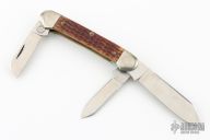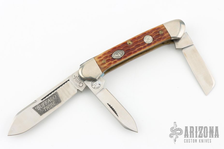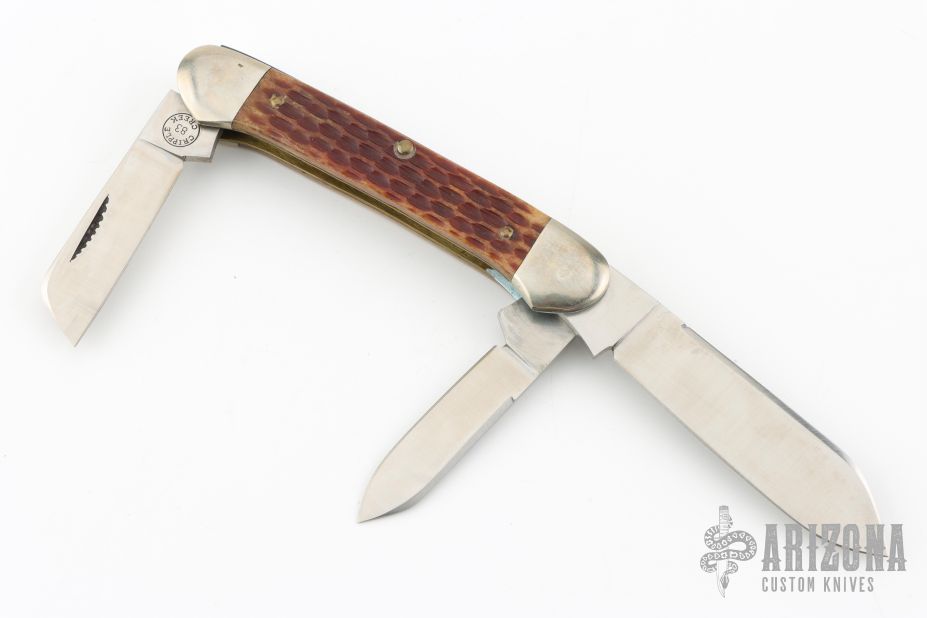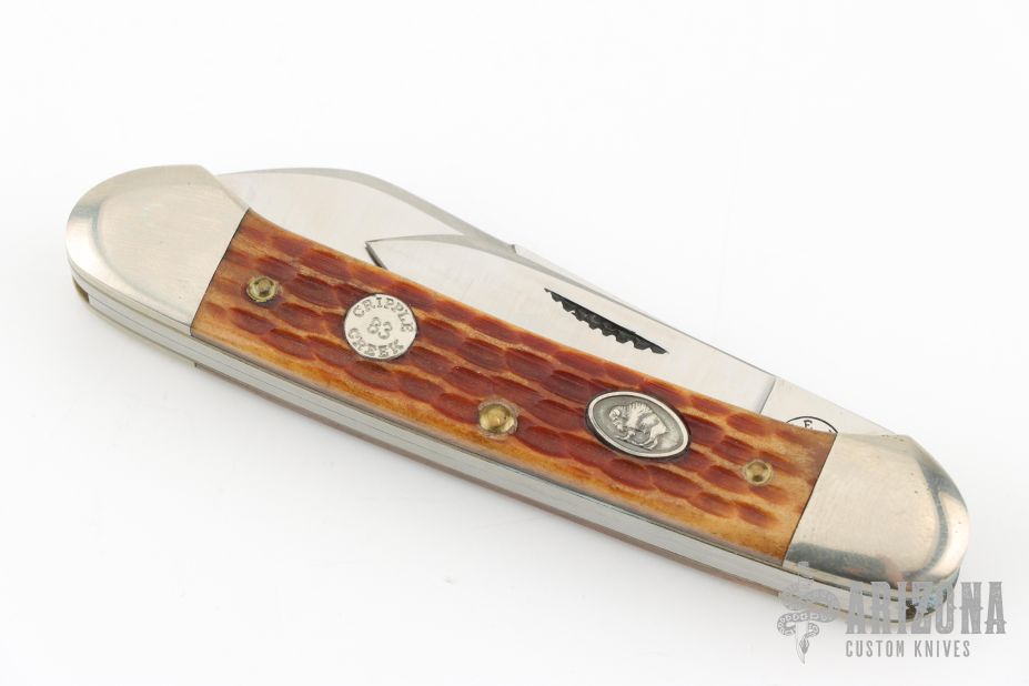 This knife by Cripple Creek features satin finished blades with nail nicks. The handle has nickel silver bolsters and bone covers over brass liners. Steel backsprings. Has some light scratches, excellent condition otherwise.