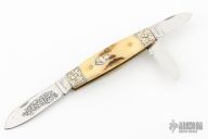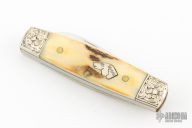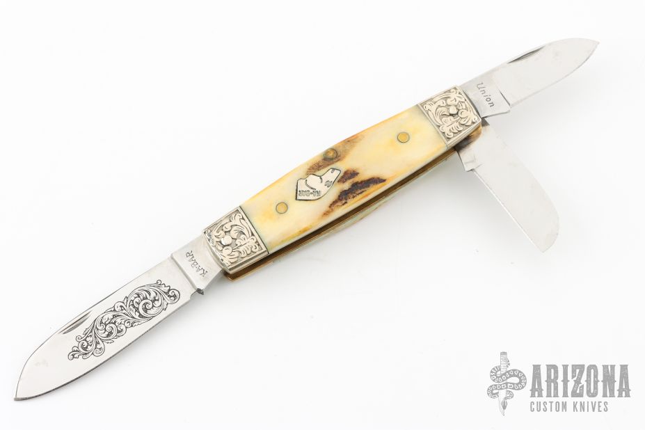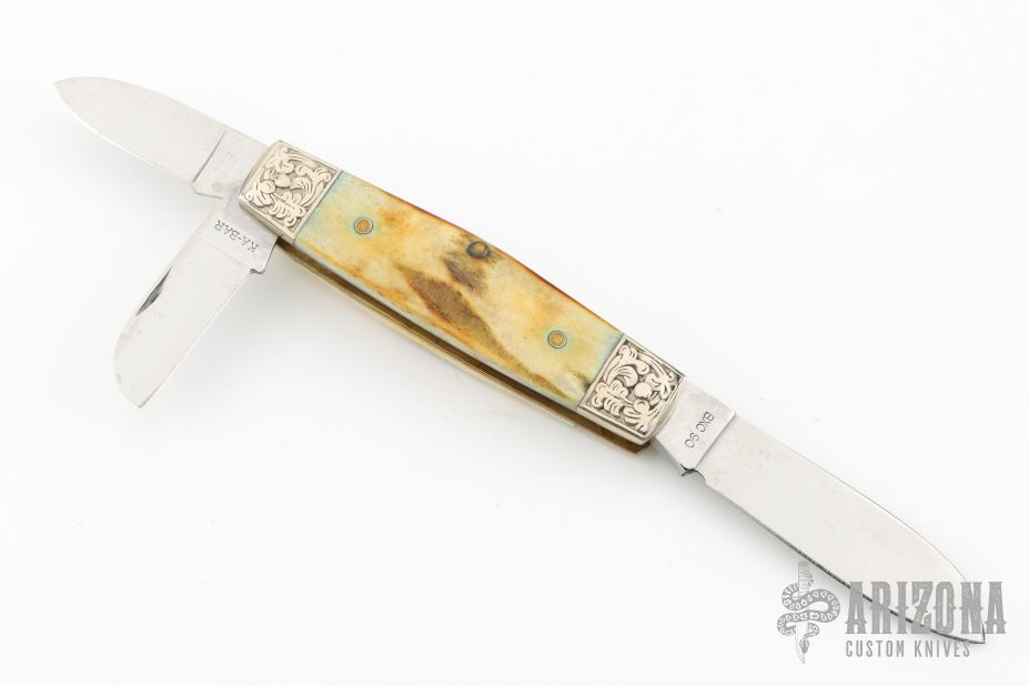This BXC90 slipjoint by Ka-Bar features mirror polished blades with nail nicks. The handle has nickel silver bolsters, bone covers, brass liners and stainless steel springs. Excellent condition. Comes with original box. #325 on the smaller blade. Engraved bolsters.