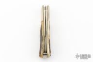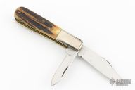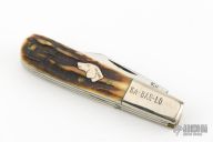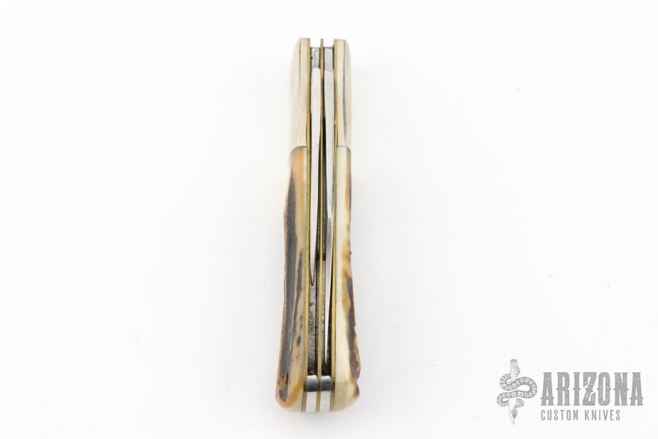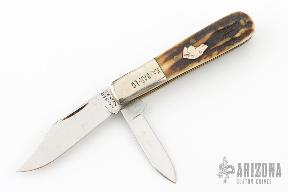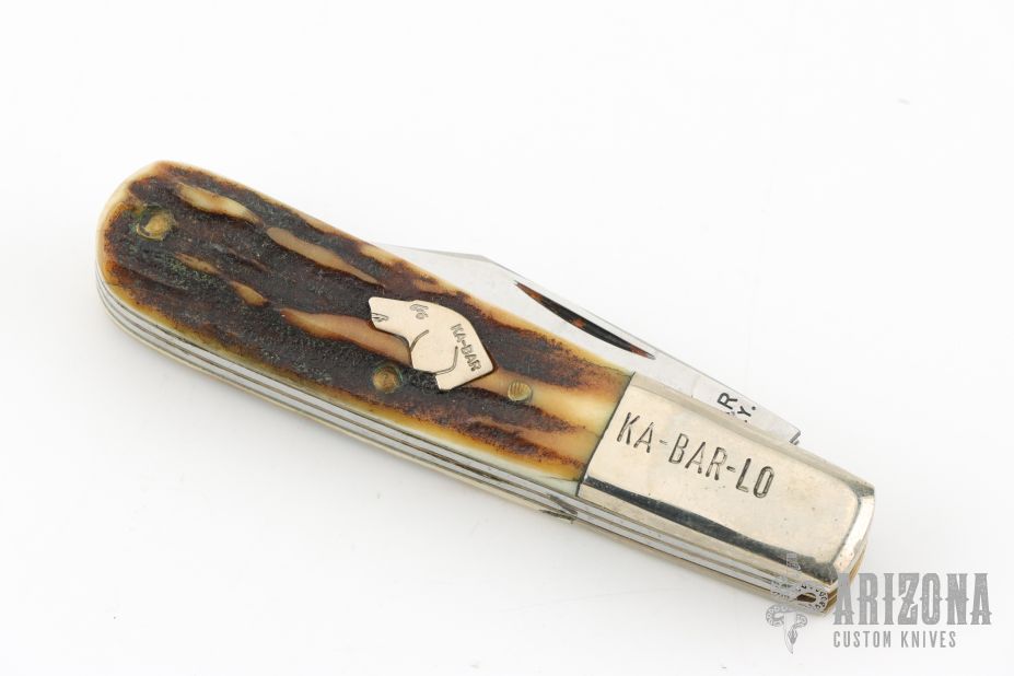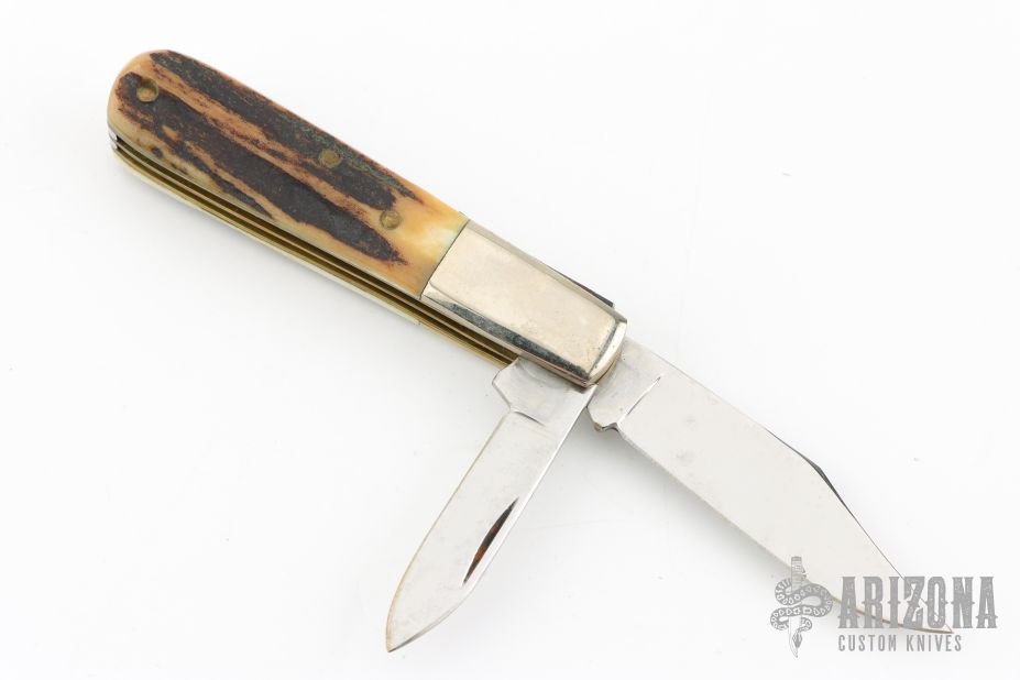 This Barlow by Ka-Bar features polished blades with nail nicks. The handle has nickel silver bolsters, stag covers, steel springs, brass liners and silver shield. Comes in original box. Has some light scratches, otherwise excellent condition.