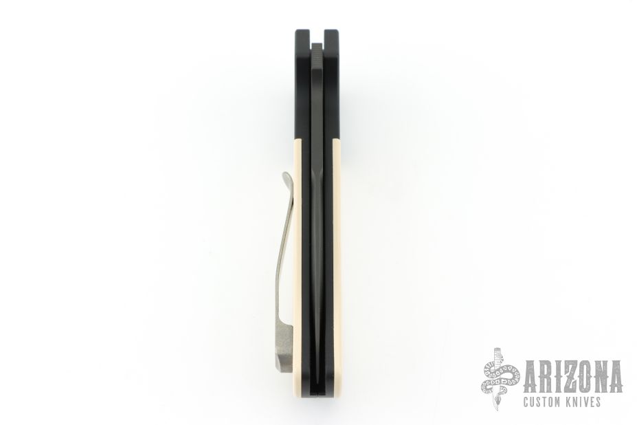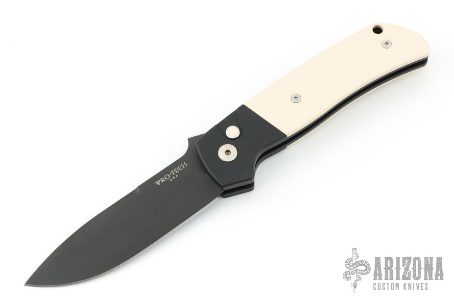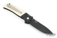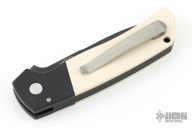 This ATCF Auto by Pro-Tech features a DLC Magnacut blade with notched thumbrest. The handle has a black aluminum frame with ivory paper micarta scales, tip up milled titanium clip with hidden screws. Comes with original box, pouch, and papers. Has a couple light scuffs, otherwise Excellent condition.