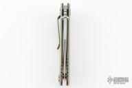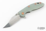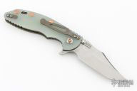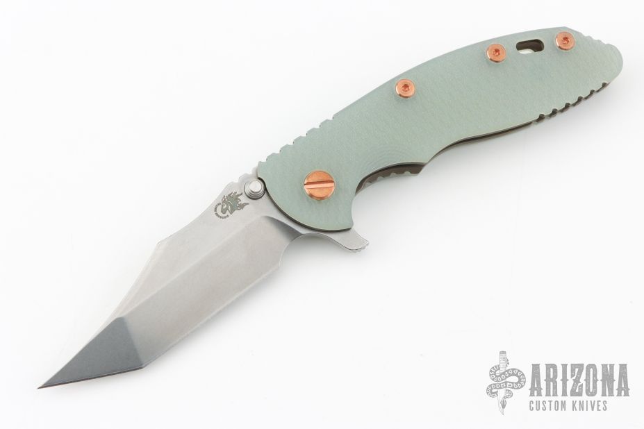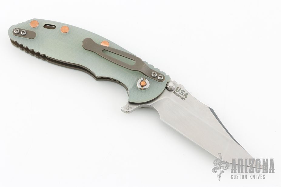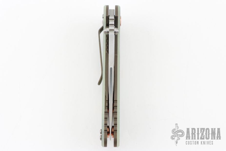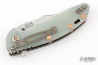 This XM-18 3.5" linerlock flipper by Rick Hinderer features a stonewash finished blade with notched thumbrest and flipper. The handle has a battle bronze finished titanium frame with green g10 covers, copper hardware, copper posts, tip up or down reversible titanium clip and lanyard hole at the butt. Comes with original box and extra washers. Excellent condition.