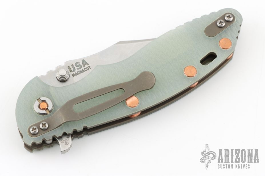 XM-18 3.5" Magnacut Liner Lock Aggressor Tri-Way Battle Bronze Stonewash Blade Translucent Green G10 Copper Hardware