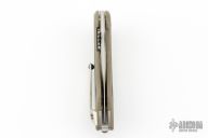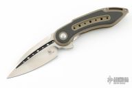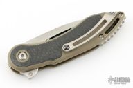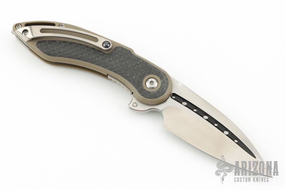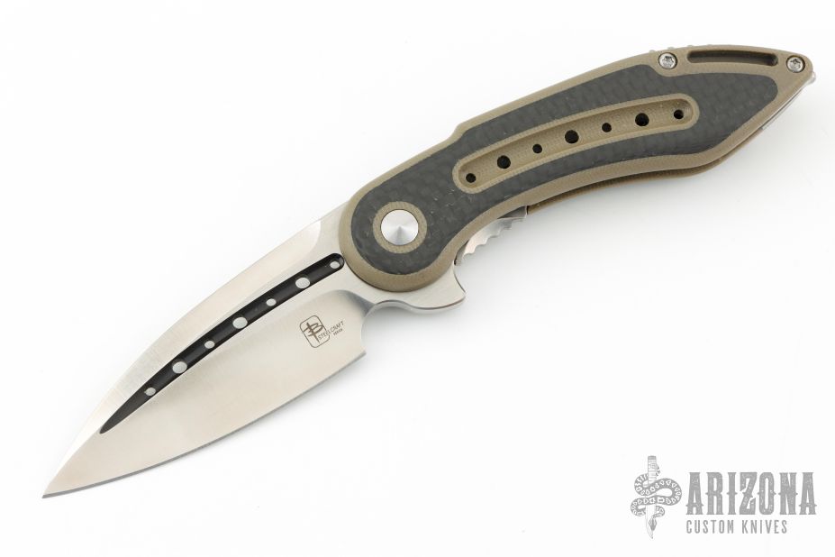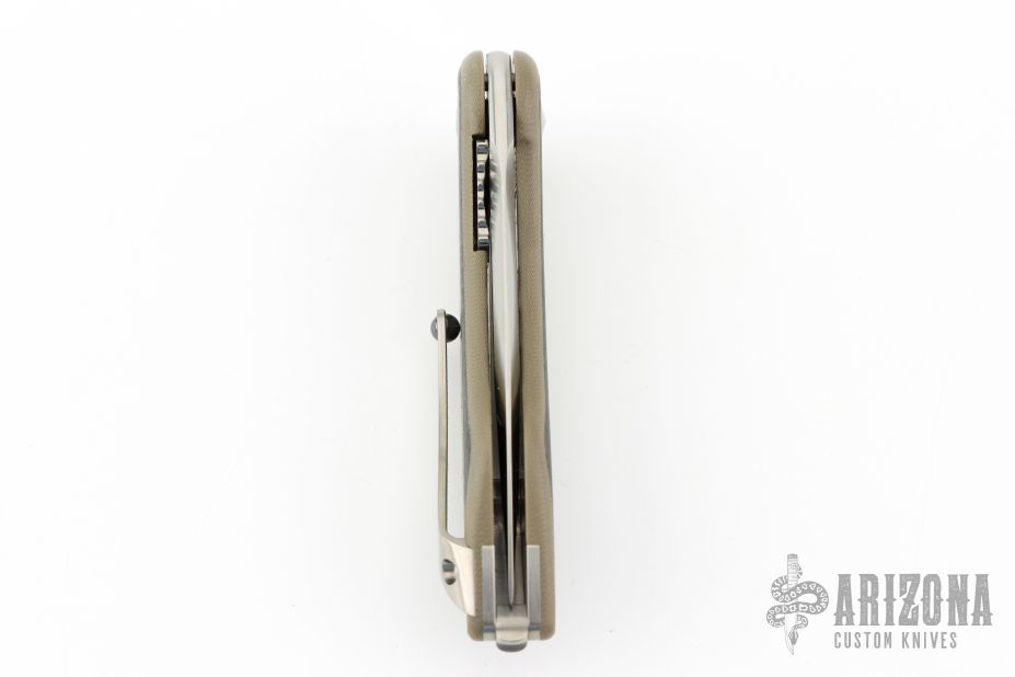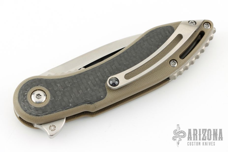 This Mini Glimpse by SteelCraft and Todd Begg features a satin finished spear point blade with fullers and a flipper. The handle has a tan G-10 frame with carbon fiber inlays, titanium backspacer and tip up clip. Rides on IKBS bearings, nice detent, lockup and blade seating. Excellent condition. Comes with original box,