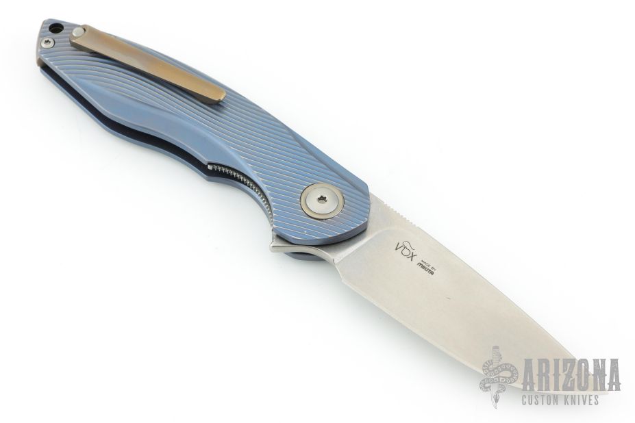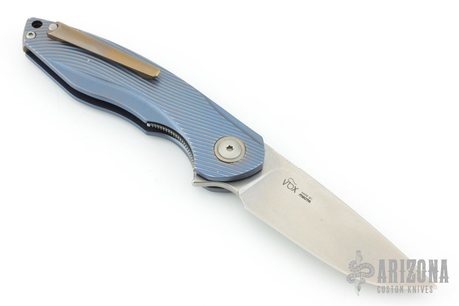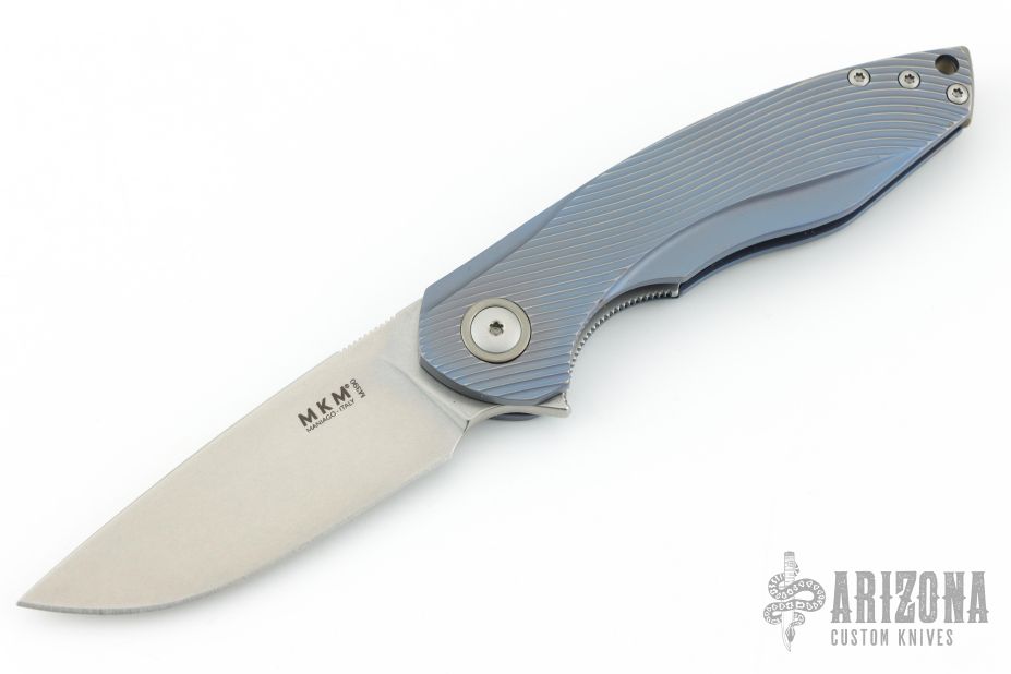 MKM and the Mikita network, deliver another wonderful collaborative design with Jesper Voxnaes with the Timavo flipper. The aesthetics are inspired by the waves and forms of a flowing river while the overall design is all about function. This version comes with blue anodized titanium handles with 3D milled texture, bronze anodized accents and a stonewashed M390 blade.