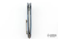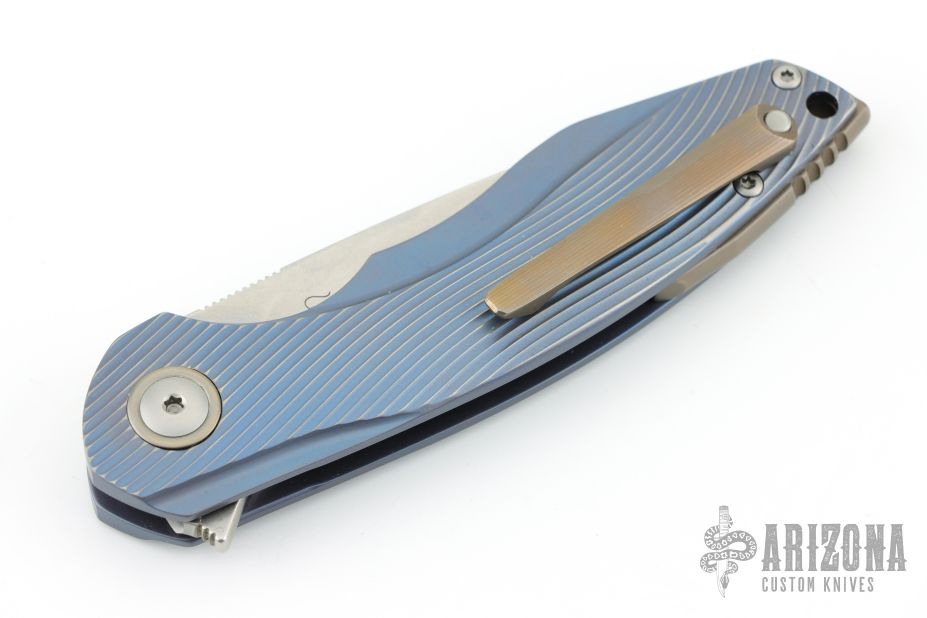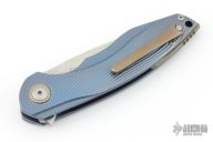 Handle: A stainless steel liner is nested within the 3D contoured titanium handle scales that have been milled with a bronze anodized 3D wave texture and finished with blue anodized grooves and contours. The handles are nicely contoured for a secure and ergonomic grip with added traction from the textured sections. The construction is completed with titanium hardware including a bronze anodized pivot collar and back spacer.