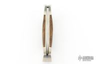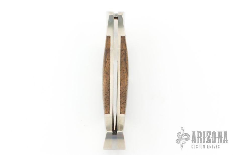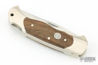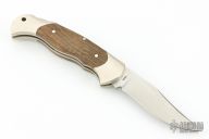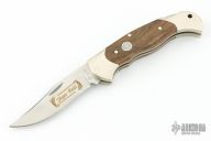 This knife by Boker features a satin finished clip point blade with nail nick. The handle has a nickel silver frame with wood inlays. Comes with original box, pouch, and papers. Excellent condition.