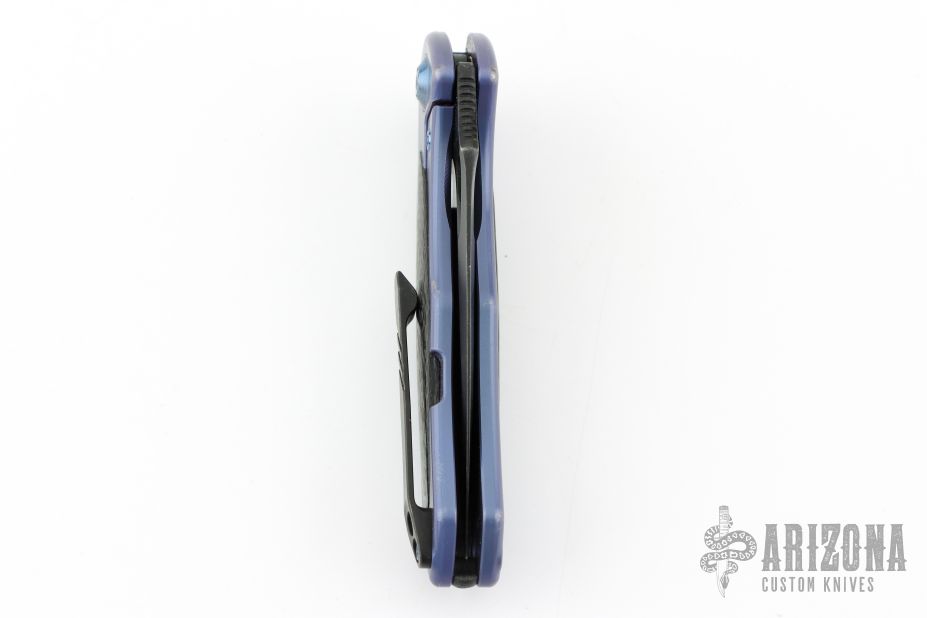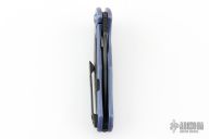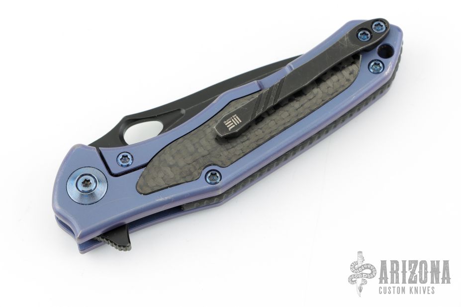The Handle: The full, blue anodized titanium construction offers strength and durability while the Carbon fiber inlays and backspacer reduce weight while giving the Vapor a classy look and feel. An integral frame lock is outfitted with a hardened steel lock face insert that delivers smooth operation and reliable lockup. The 3D machined titanium pocket clip provides secure carry and fast draw in either left or right hand carry (tip-up only).