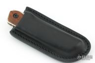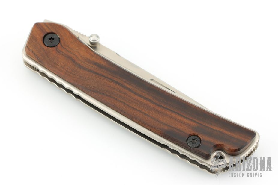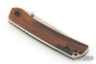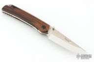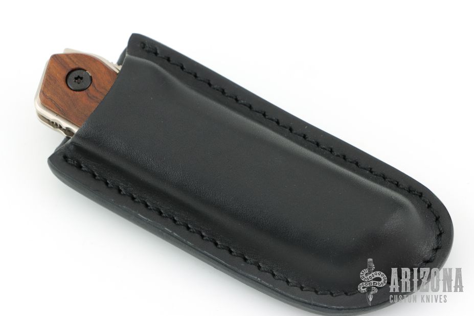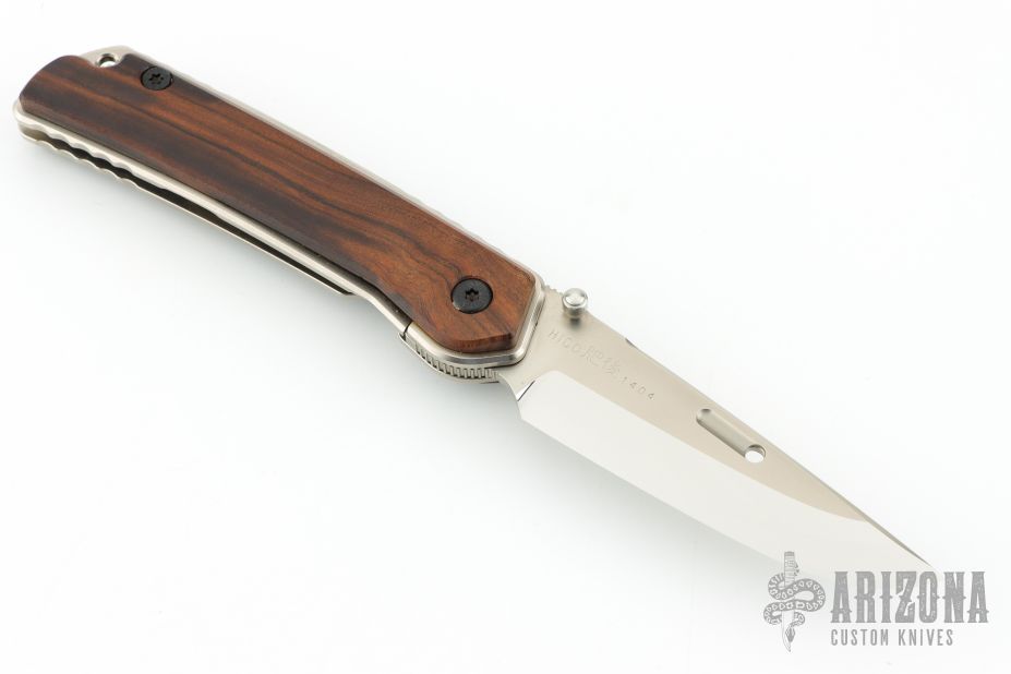 This Higo from Rockstead features a two toned drop point blade with mirror polished grinds, dual thumb studs and notched thumbrest. The handle is comprised of ironwood scales over steel liners and a single barrel spacer. Lanyard hole in pommel. Includes original box, COA and black leather belt sheath. The box is missing the black paper outer sleeve. Has a couple light scuffs, excellent condition otherwise.