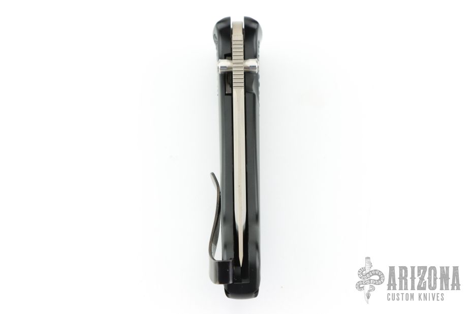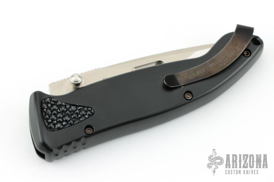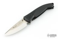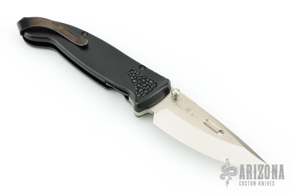 "The blade is convex on both sides in the tradition of the highly praised Japanese sword. This shape is both sharp and strong, and can still slice paper even after the 1,000 of hemp rope cuts. Using this blade form is one superb method of making an edge thick without losing of its sharpness. This is a knife of preeminent sharpness. You can enjoy its strong cutting capabilities for a long time. Even if used for rigorous cutting, the blade will not bite thanks to its convex shape. Other knives often will bite, and may nick if it is pulled out suddenly at that time. This knife scratches the plate of china. Please do not use it to cut food on the plate." The blade is ZDP-189 steel with notched thumbrest and dual thumbstuds, mirror polished blade grind. The handle is black aluminum with rayskin inlay and tip up stainless steel clip. Comes with original wooden box and papers. The box is missing the black paper outer sleeve. Has a couple light scuffs, otherwise excellent condition. S/N 211.
