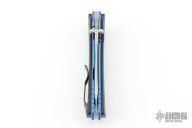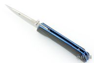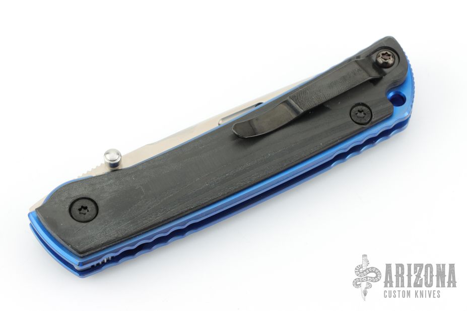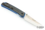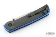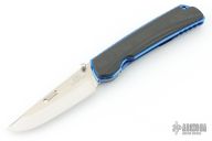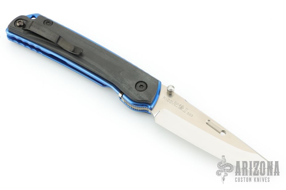This Higo from Rockstead features a two-tone drop point blade with mirror polished grinds, dual thumb studs and notched thumbrest. The handle is comprised of carbon fiber scales over anodized titanium liners and a single barrel spacer. Lanyard hole in pommel. Includes original box and papers. The box does not have the black paper outer sleeve. Has a couple light scuffs, otherwise Excellent condition.