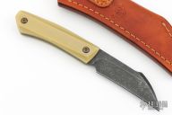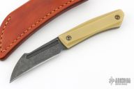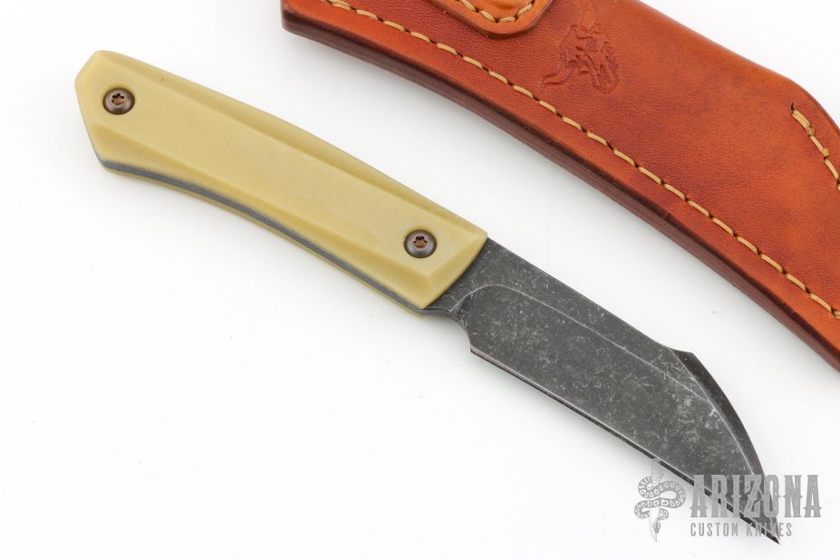 This Sparrow by Jason Stout features a chisel grind acid/tumbled blade with .140" blade stock and .982" blade depth, full tang construction. The handle has bone linen micarta scales. Comes with a York custom leather sheath and COA dated 6/20/20. Excellent condition.