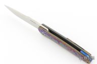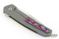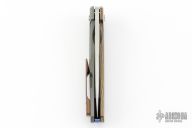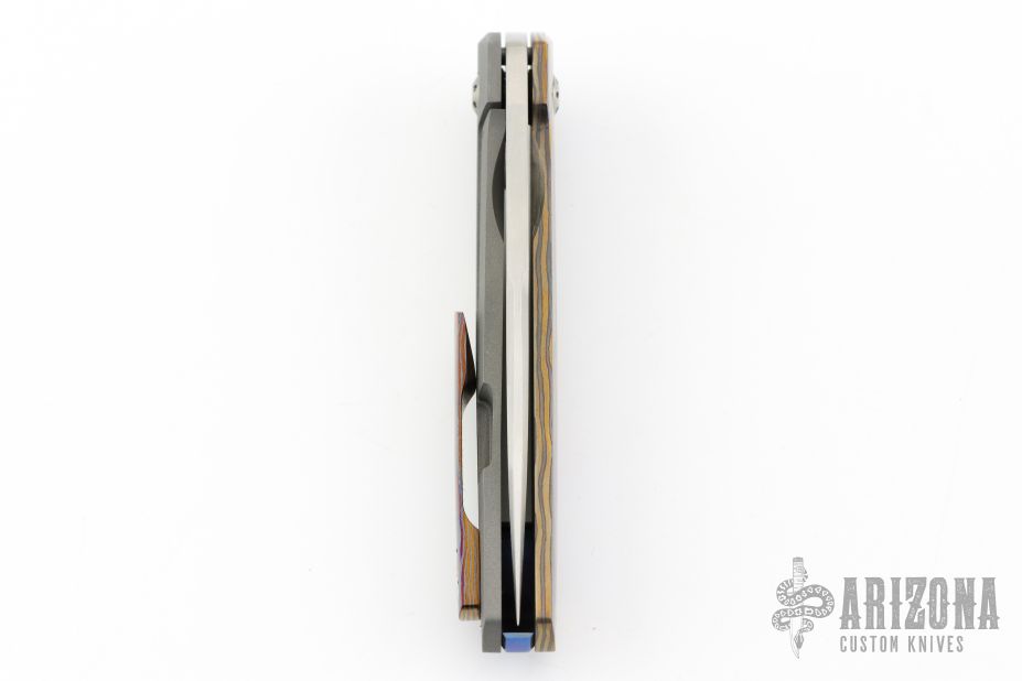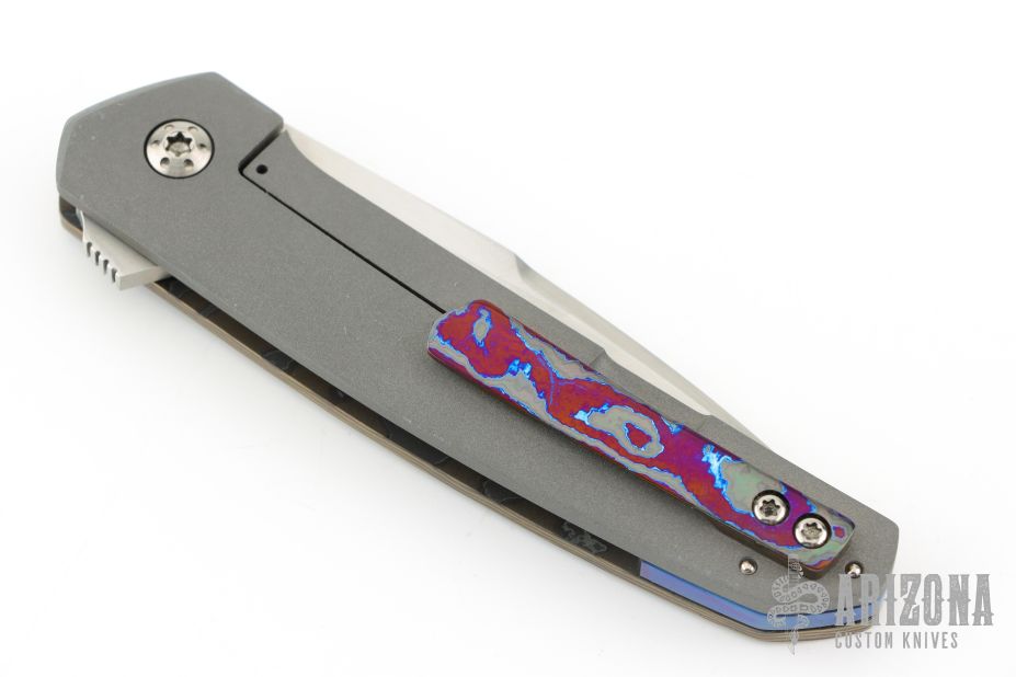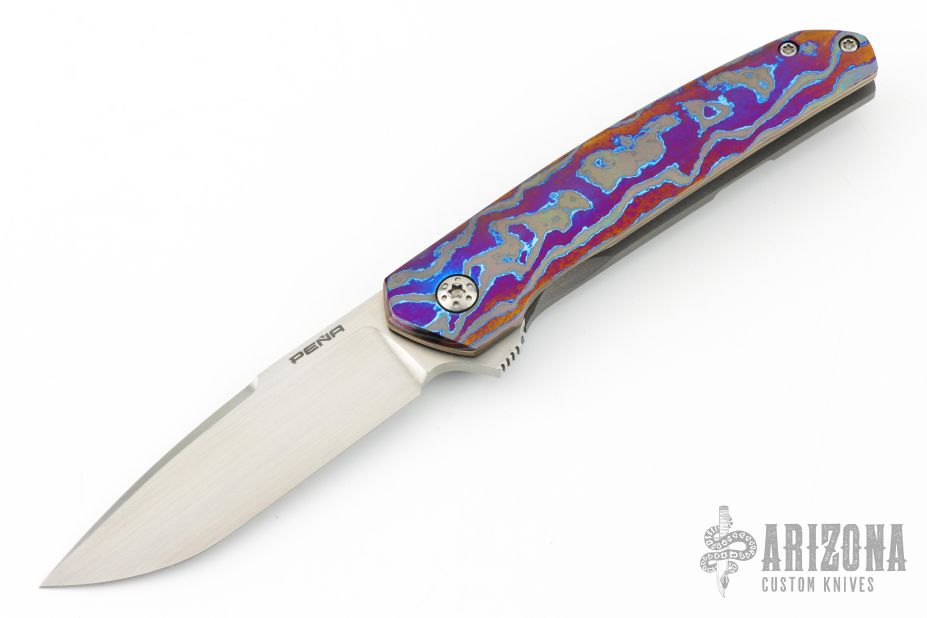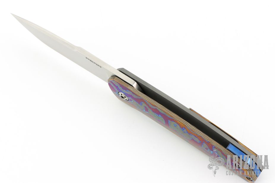 This Cobra Flipper by Enrique Pena features a hand rub satin finished drop point blade with swedge, notched thumbrest and flipper. The handle has a ZircuTi and bead blasted titanium frame with ZircuTi tip up clip. Nice detent, lockup and blade seating. Comes with Maker's zippered case. Excellent condition.