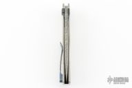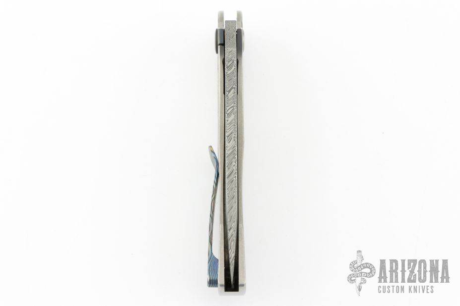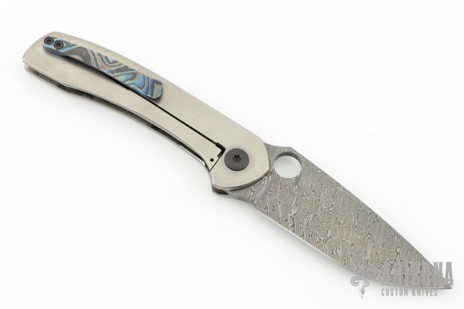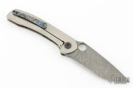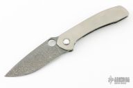 This Sabre Integral by Maverick Concepts features a Damasteel blade with thumbhole. The handle has a stonewashed integral titanium frame with 4-Alloy Dark Ti clip, Mother of pearl inlaid pivot screw. Comes with a zipper case and COA dated 10/21/21. Excellent condition.
