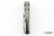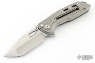 The Reate T1000 is a robust pocket knife that goes 110% on lock strength and 120% on general beefiness. Its hollow-ground tanto blade—made from super tough CPM 3V steel—flips open smoothly on a ball bearing pivot. There, the frame lock engages. For a normal knife, that would be enough; with the T1000, we're just getting started! You can engage two other optional locks: a button on either side of the pivot. Push these in, and there are now three points of contact keeping the blade secure; you can also engage the two button locks when the knife is closed. These buttons aren't traditional button locks: To disengage them, you'll need to push up on the slider on the spine of the knife's handle. Despite its size, the T1000 is ergonomic and smooth to operate. Its chunky, beautifully styled titanium handle will comfortably fill a larger hand, and its near-quarter-inch thick blade will take a beating and dish out an even bigger one. For cutting jobs small, large, or mammoth, the T1000 will perform like a champion. Without a doubt, this monster of a flipper knife is worthy of its namesake.