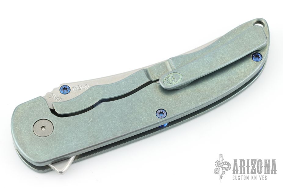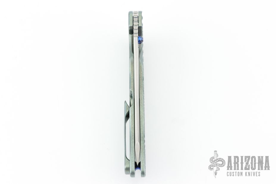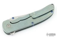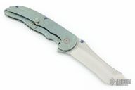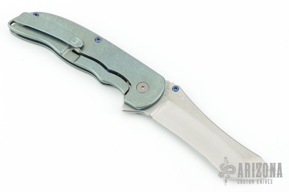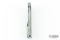 This Norseman by John Grimsmo features a stonewashed blade with a single anodized titanium thumb stud, notched thumb ramp and flipper. Stonewash and anodized finished titanium frame with anodized titanium screws. Has a matching clip with hidden screws. Very smooth action that requires no wrist movement. Nice detent, lockup and blade seating. Rides on ceramic bearings. Comes with original packaging, custom hard case, Nano-Oil, tool, and COA dated March 6, 2019. Excellent condition.