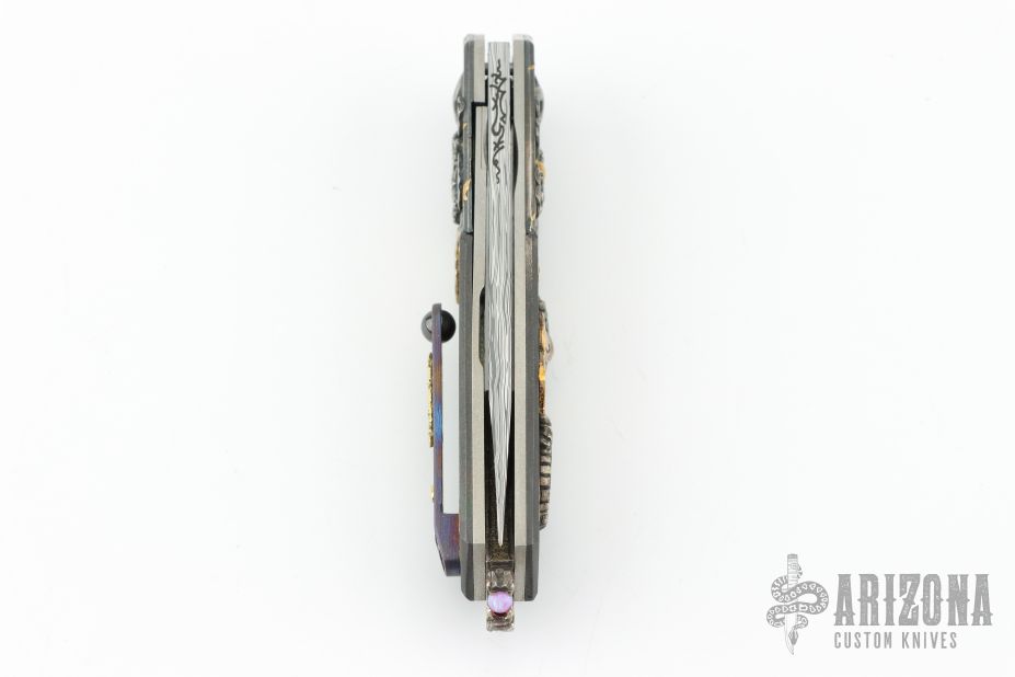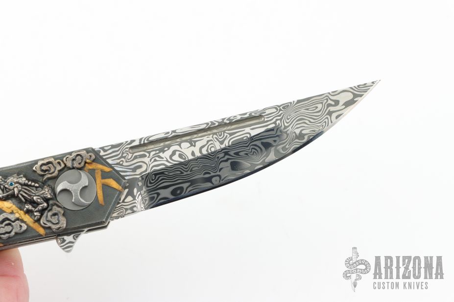 This Special Kaiken 2 Flipper, by Glenn Waters, features a Damasteel blade with fullers and a flipper. The handle is composed of zirconium covers, titanium liners with sculpted silver dragon backspacer with lab grown opal the mouth. The tip up pocket clip is composed of mokuti. There is a ceramic ball inlaid into the pocket clip and also has 24k gold overlays. The handle has overlays/inlays/insets of .925 silver, 24kt gold and blue diamonds. Includes original box, papers and a padded zippered case. Excellent Condition. Card is marked 2018 Japan.