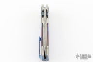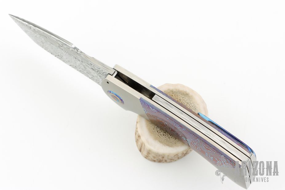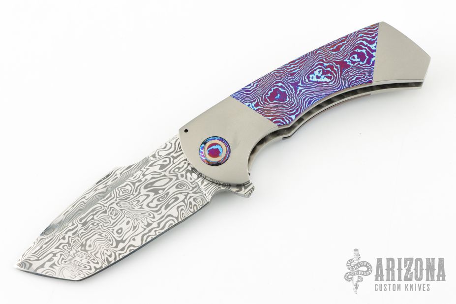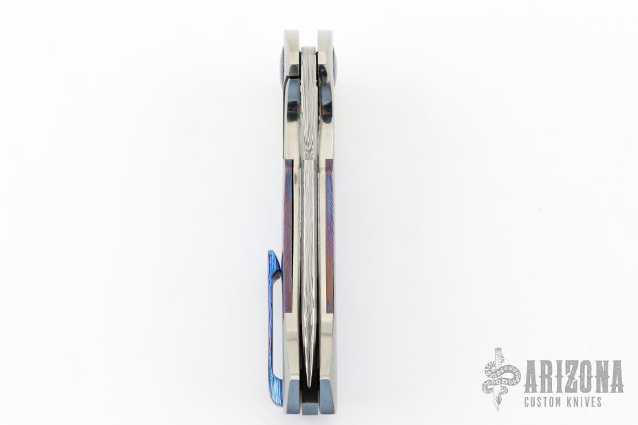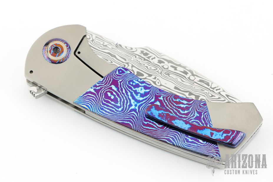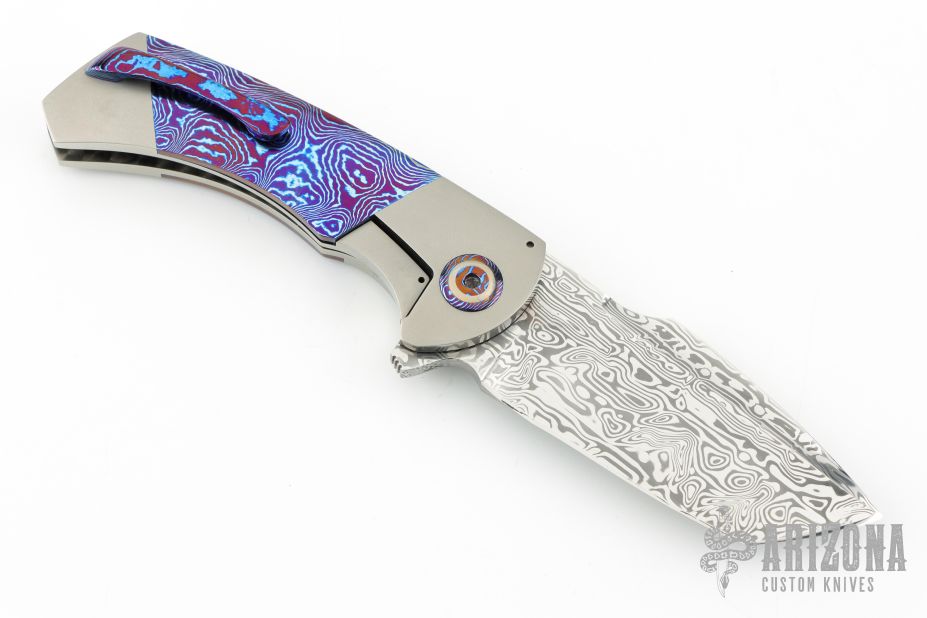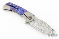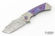 This Kamehameha Flipper features a Damasteel tanto blade with a false top edge.  The handle has bead blast finished front/rear bolsters, mokuti scales over jeweled/polished titanium liners, floating Damasteel backspacer and a tip up mokuti pocket clip with hidden hardware. Matching pivot and pivot collars. Note from the consignor: this is TJ's first double bolster knife and hand-fitted joints. Comes in a clasped hard case. Excellent condition.