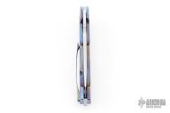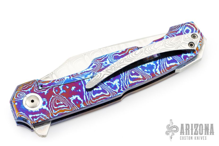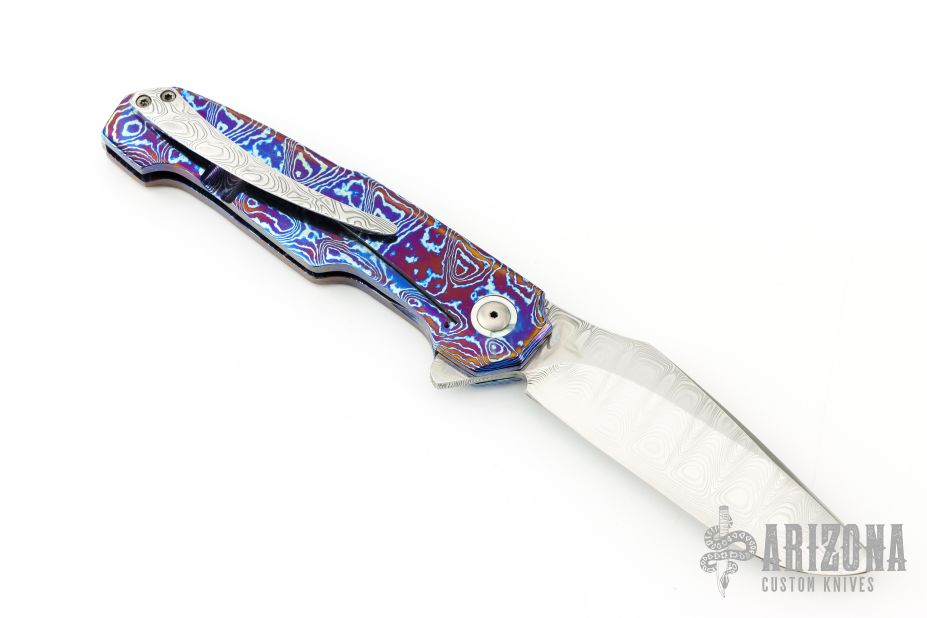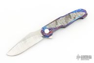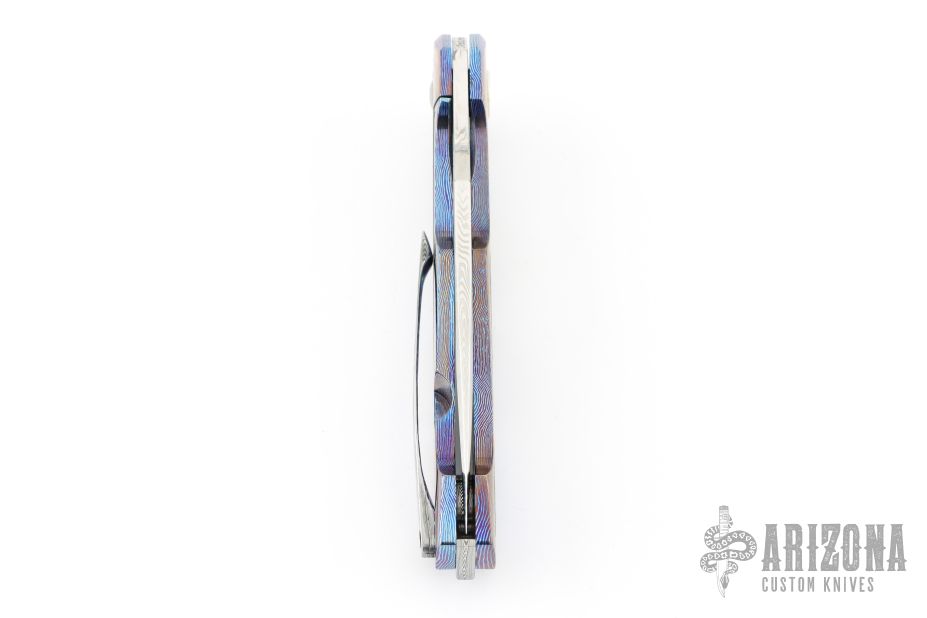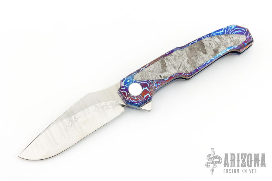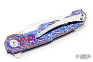 This Boudicca by Anton van der Westhuizen features a polished Damasteel blade with a thumbhole. The handle has a Mokuti frame with meteorite inlays, pearl pivot and collar, Damascus backspacer and tip up clip. Rides on ceramic IKBS, nice detent, lockup and blade seating. Has concealed hardware and overtravel stop. Comes with original zippered case and COA dated 2020. Excellent condition.