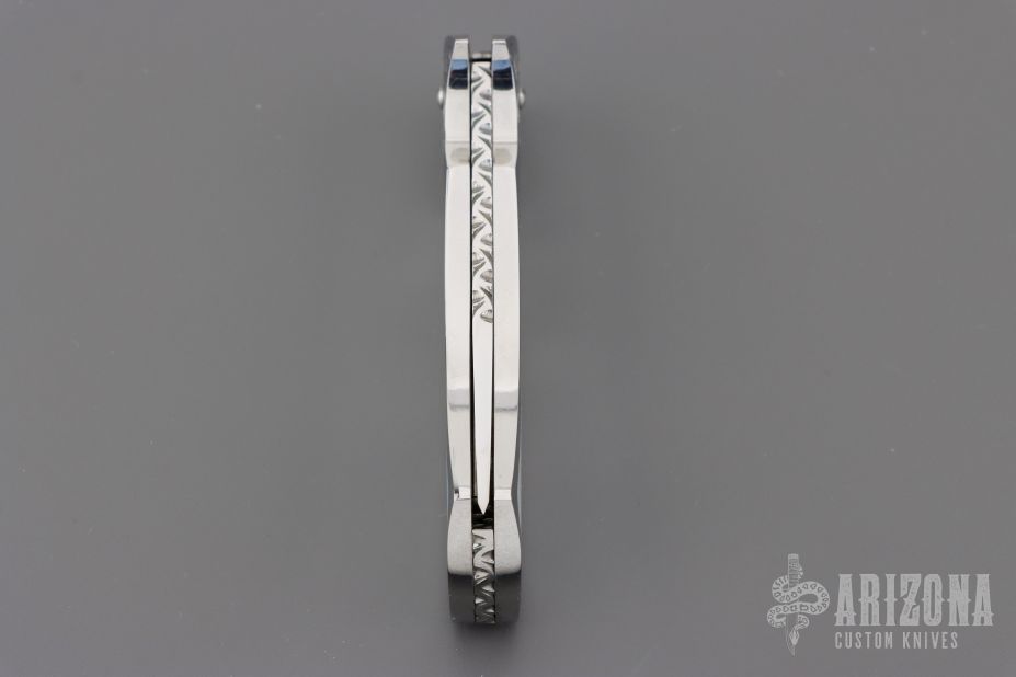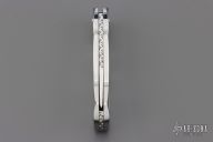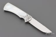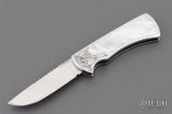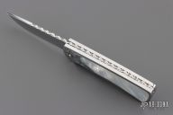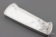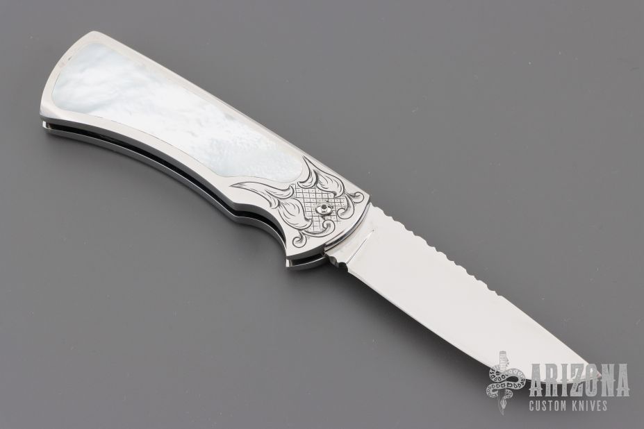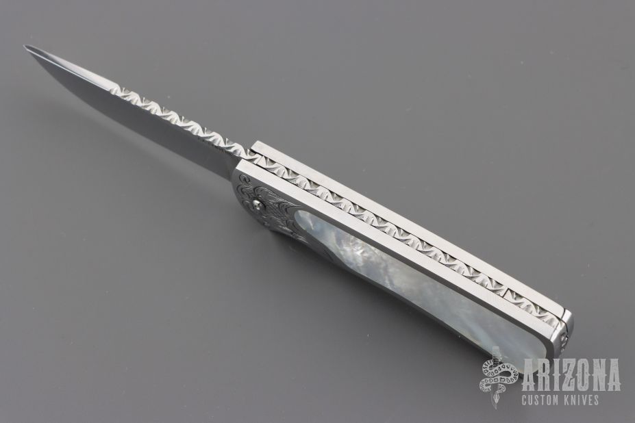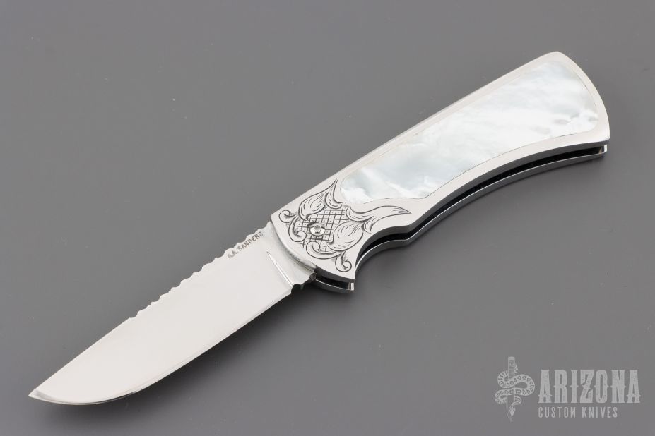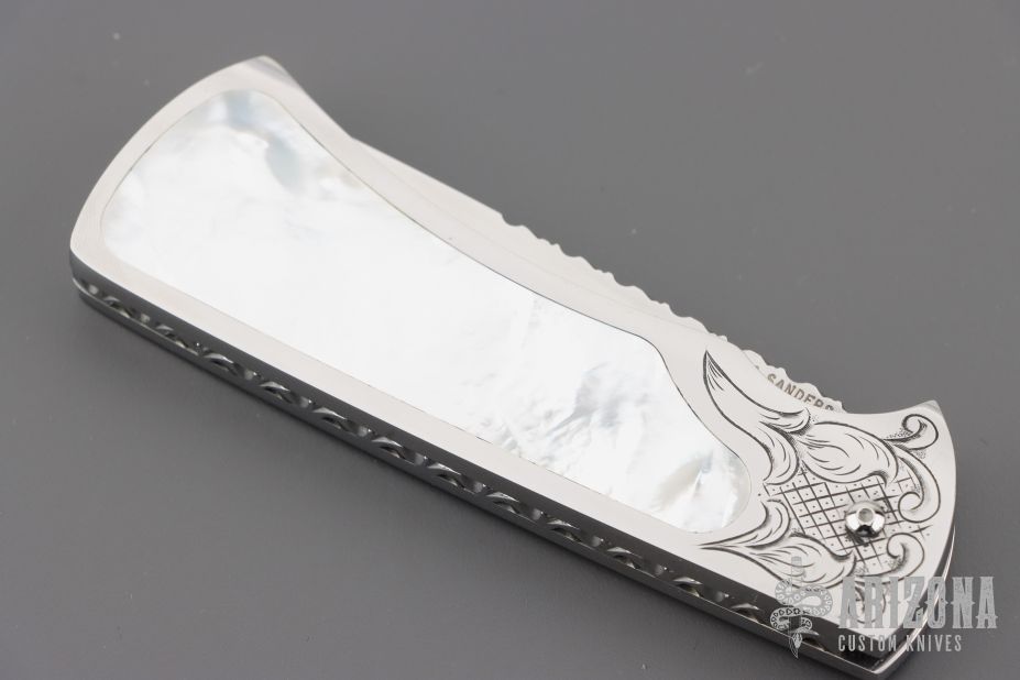 This scale release interframe auto from A.A. Sanders features a mirror polished drop point blade with file worked spine. The handle has an engraved stainless steel frame with mother of pearl inlays and fileworked stainless steel backspacer. Strong spring action. Comes in a zipper case. Has a few light scratches, otherwise excellent condition.