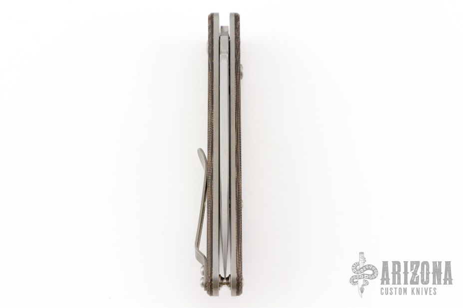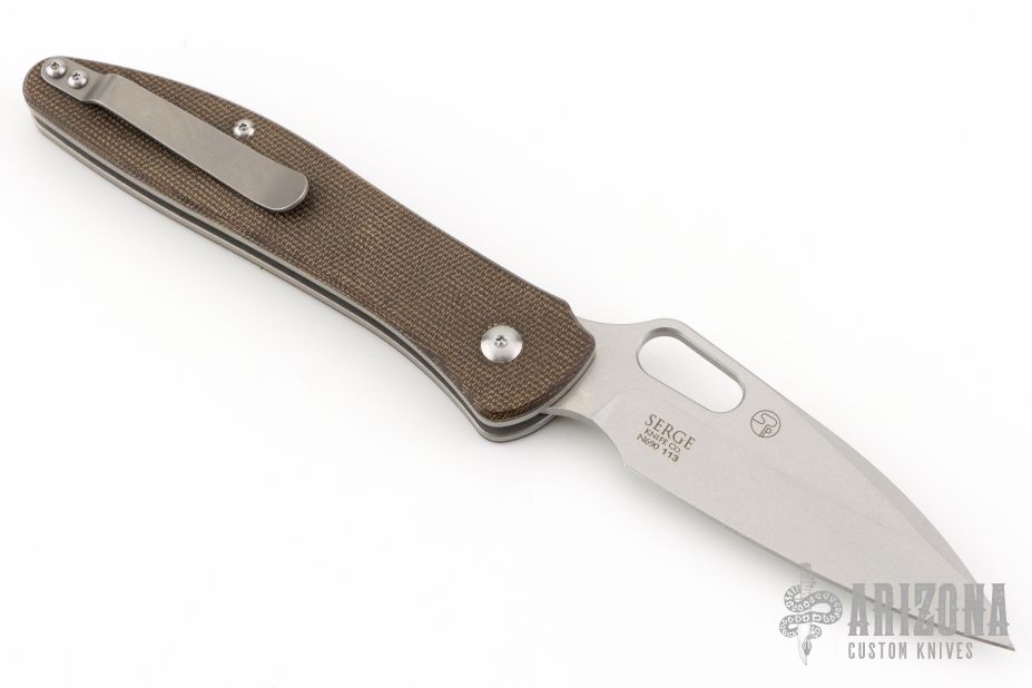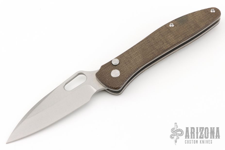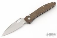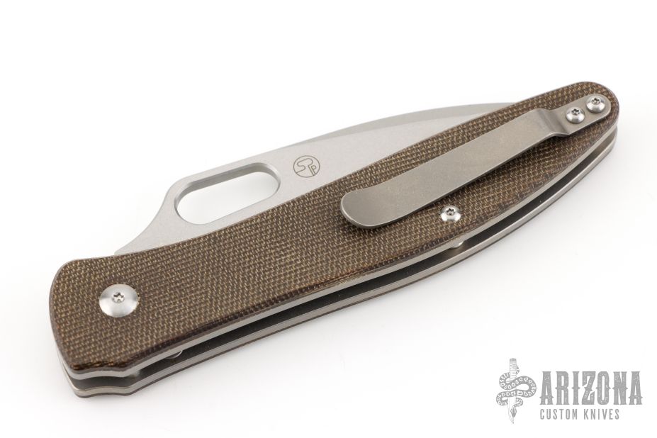 This Rager from Serge Panchenko features a stonewashed blade with a thumbhole. The handle has micarta scales over blasted titanium scales with a matching tip up pocket clip. Includes the original box tools, and papers. Excellent Condtion.