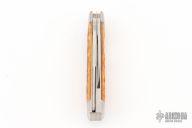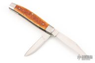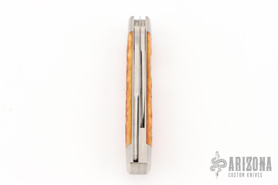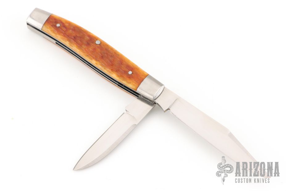 This knife by Ken Erickson features two hand rub satin finished blades with nail nick and long pull. The handle has integral stainless steel bolsters, honey Jigged Bone covers, stainless steel liners and springs. Has half-stops, flush in all positions. Comes with a zippered case. Has a couple light scuffs, otherwise Excellent condition.