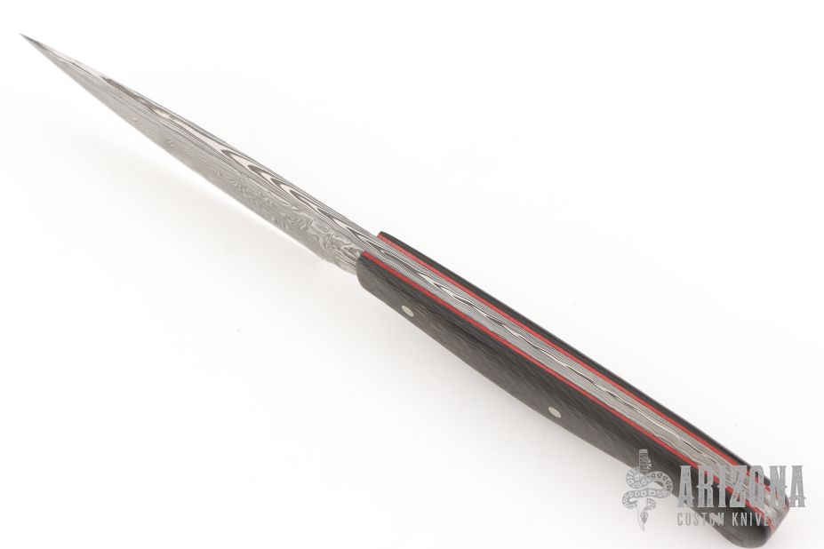 This paring knife by Jesper Vox features a polished drop point Damasteel blade with .157" bladestock and .784" blade depth with full tang construction. The handle has pinned carbon fiber covers, with red liners. Comes in a zipper case and email from Vox. Excellent condition.