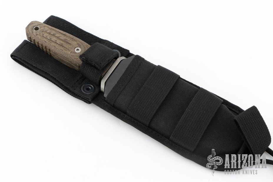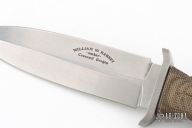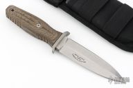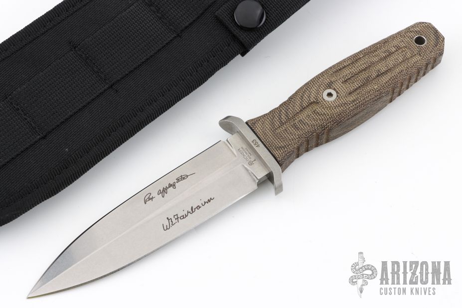 This Applegate-Fairbairn Premium Edition Combat Dagger (#453) has a bead blast 440C stainless steel D/E spear point blade with hidden tang. Etched signatures on front and back (including Bill Harsey on the back) Blade stock is 3/16", depth is 1-1/16". Handle is non-slip green canvas micarta with contoured grooves, bead blasted aluminum guard, and lanyard hole. Comes with deluxe spec ops nylon over Kydex sheath and original box papers. Excellent condition.