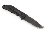 The 18-XRAY is a Darrel Ralph designed automatic using Darrel's SAS (Slide Auto Safety) mechanism. The release button must be moved to the fire position to open the blade, and it automatically returns to safe mode when closed, keeping your fingers safe from accidental closure. When you close the knife again, the release button is returned to the safe position. This Camillus 18-XRAY has a black partially serrated blade with notched thumbrest. The handle has a black aluminum frame with black stainless steel clip. Excellent condition.