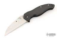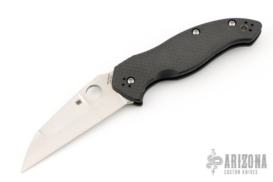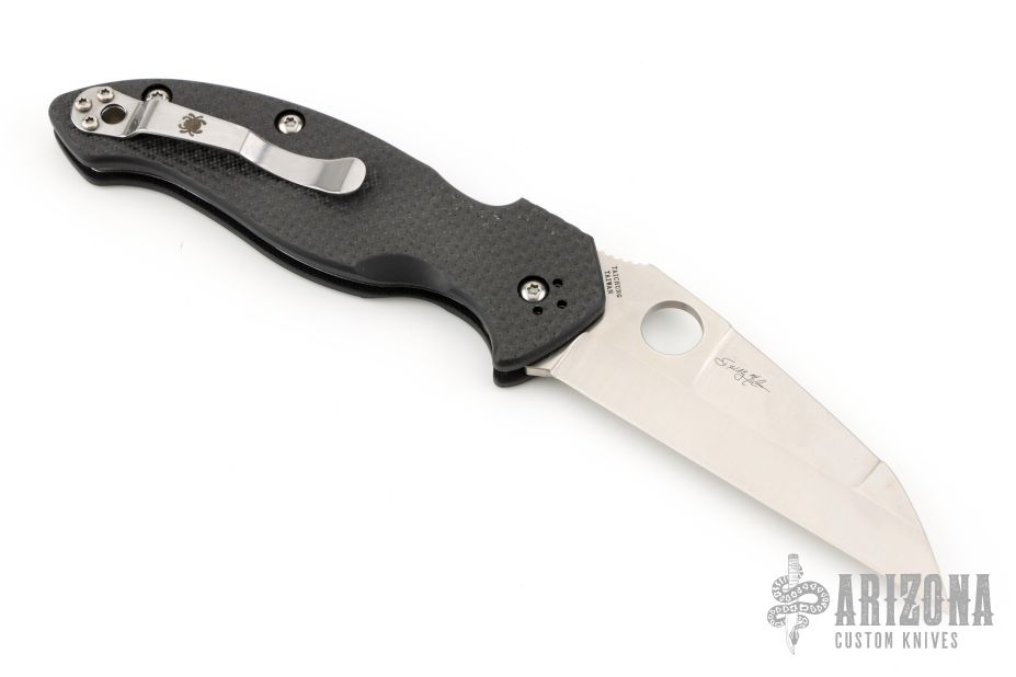 The Canis from Spyderco is a spectacle of a knife designed for everyday carry. The blade is made of CPM-S30V, and features a truly unique blade profile and grind. It has a Wharncliffe shape, a flat grind, and a ground out section which reduces weight, but full spine thickness near the tip to reinforce it. The handle is made of a carbon fiber/G-10 laminate with a gentle texture to hold it nicely in the hand.