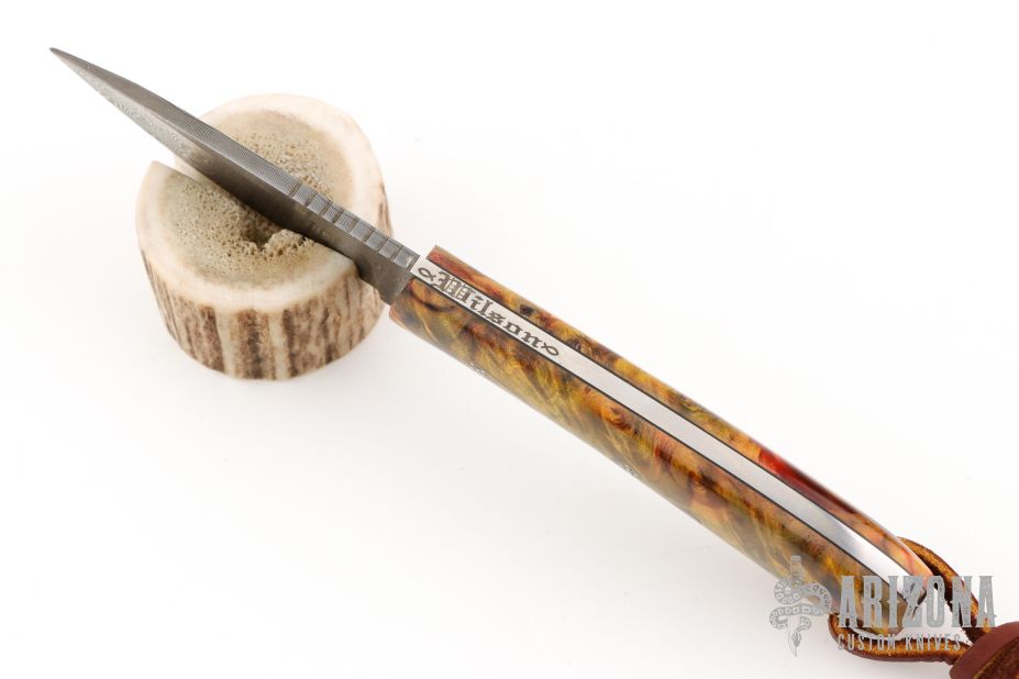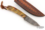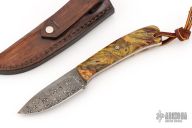 This knife by Mike Wilson features a Nichols Damascus blade with notched thumbrest, .139" blade stock and 1.091" blade depth, full tang construction. The handle has Buckeye burl scales wtih black liners and mosaic pins. Comes with a leather belt sheath. Has a couple light scratches, otherwise excellent condition.