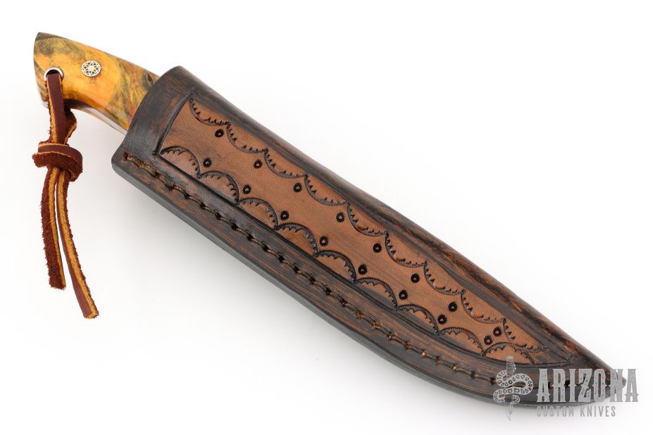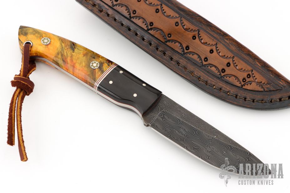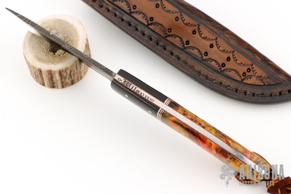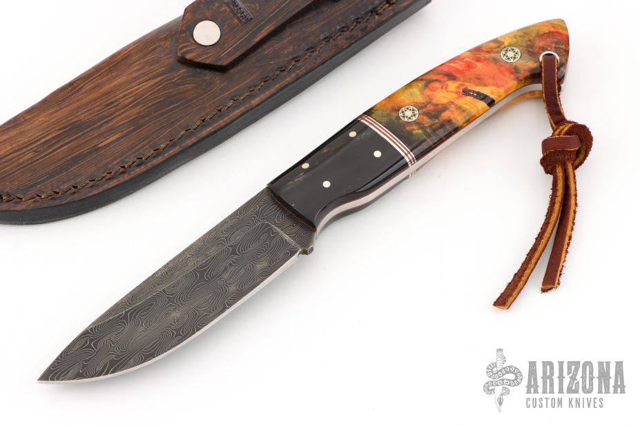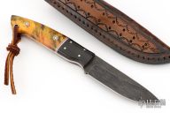 This knife by Mike Wilson features a Nichols Damascus blade with notched thumbrest, .134" blade stock and 1.078" blade depth, full tang construction. The handle has fireball Buckeye burl scales wtih red liners, buffalo horn bolsters, and mosaic pins. Comes with a leather belt sheath. Has a couple light scratches, otherwise excellent condition.