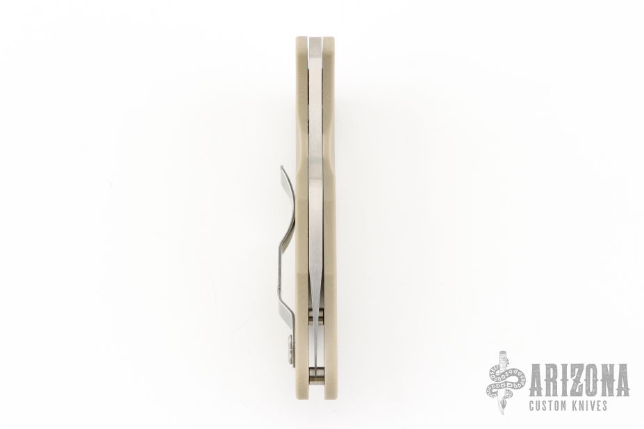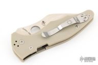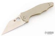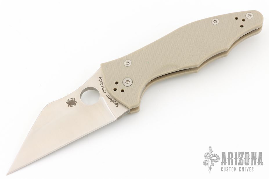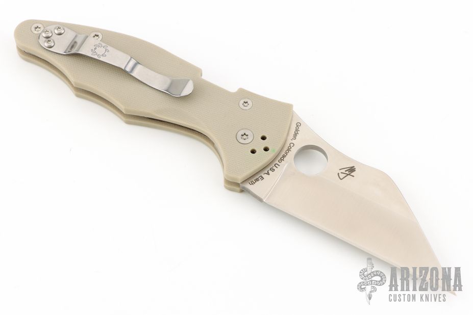 This Yojimbo 2 by Spyderco features a satin finished wharncliffe blade with thumbhole. The handle has a tan G-10 frame with stainless steel liners, lock is on the spine of handle. 4-way reversible stainless steel clip. Nice detent, lockup and blade seating. Comes with original box and papers. New Condition.