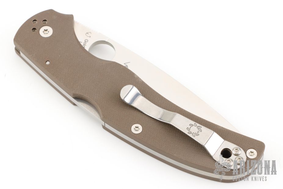 This Native Chief by Spyderco features a satin blade, brown G-10 scales, black stainless steel backspacer and 4-way reversible clip. Comes with original box and papers. New condition.
