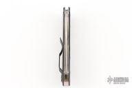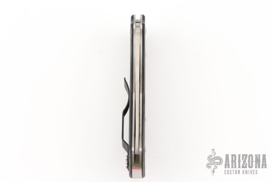 This lock-back folder features a satin finished blade with thumb-hole and notched thumbrest. The handle has carbon fiber scales, stainless steel liners and back-spacer, and black stainless steel clip, 4-way reversible. Comes with original box and papers. New condition.