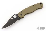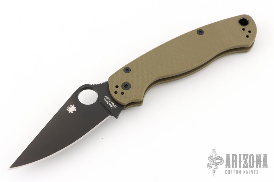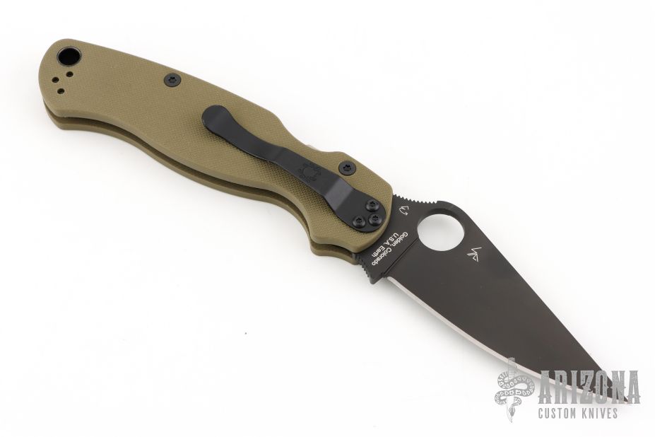 This Paramilitary 2 Folder from Spyderco has a black clip point blade with thumbhole and notched thumbrest. Handle is green G-10 with stainless steel liners and black 4-way reversible clip. Has a couple light scuffs otherwise  Comes with original box and papers.  New condition.