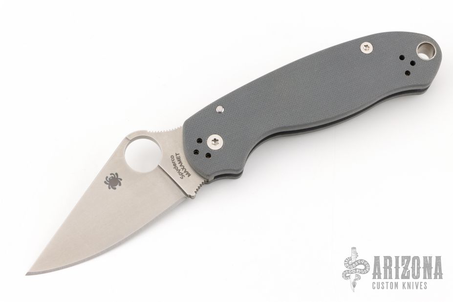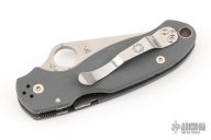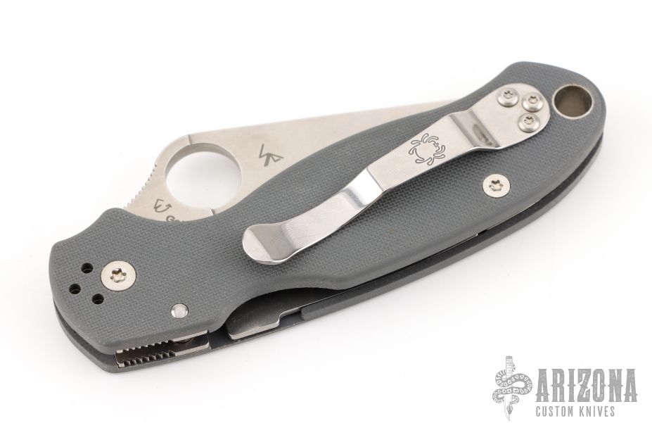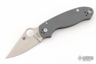 This Paramilitary 3 Linerlock Folder from Spyderco has a stonewashed finished clip point blade with thumbhole and notched thumb rest. Handle has grey G-10 scales with nested stainless steel liners and 4-way reversible clip. Includes the original box and papers.  New condition.