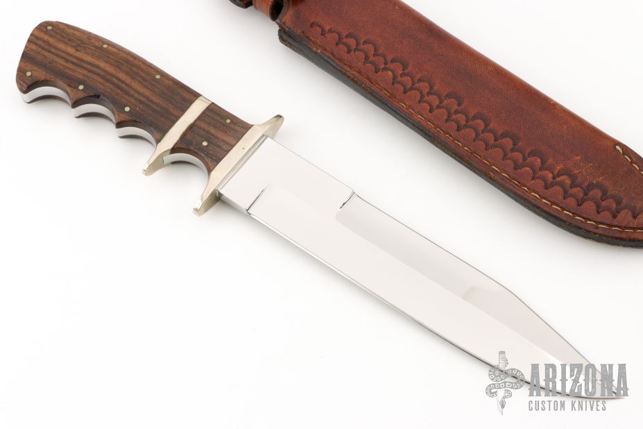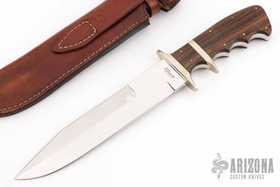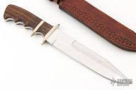 This Sub-Hilt Fighter by Devon Butch Beaver features a mirror finished double-edged blade, .253" blade stock and 1.430" blade depth, full tang construction. The handle has a nickel silver guard and sub-hilt with wood scales. Comes with a zippered case and leather sheath. Has some scratches, and patina. Great condition otherwise.