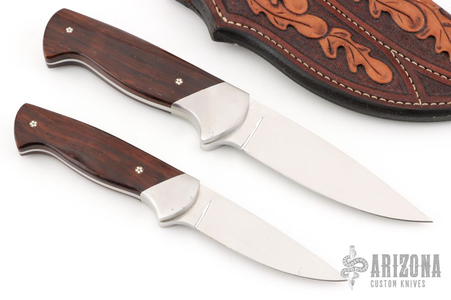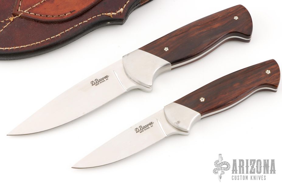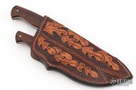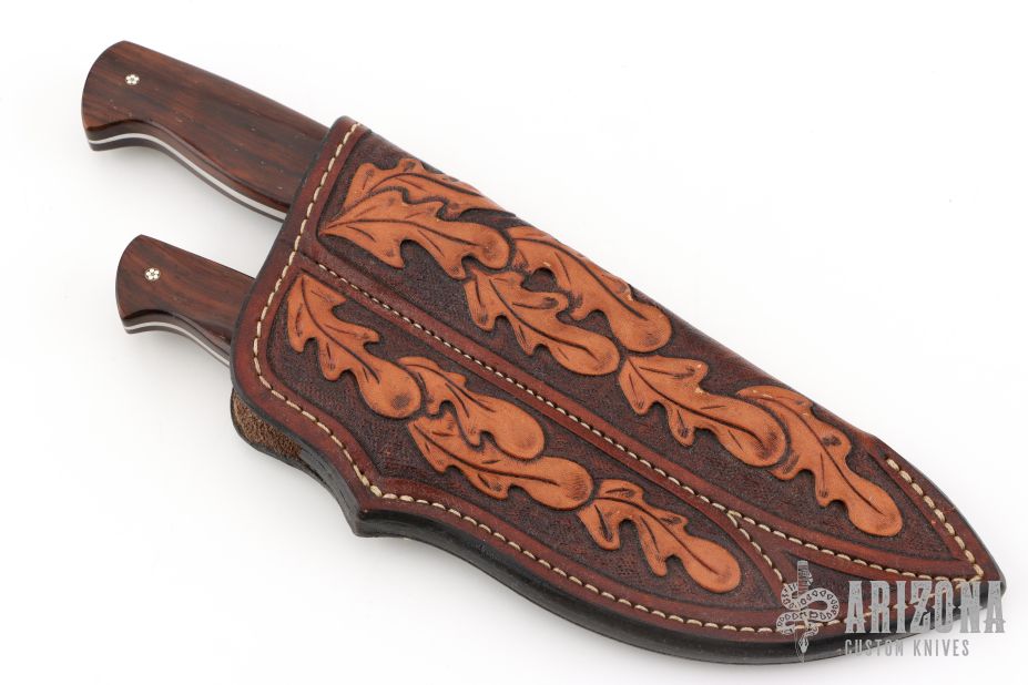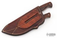 This Hunter by Devon Butch Beaver features a hand rub satin finished blade with .177" blade stock and 1.048" blade depth, full tapered tang construction. The handle has stainless steel bolsters, wood scales with mosaic pins. Comes with a hand tooled brown leather tandem sheath. Has a couple light rust spots, excellent condition otherwise. 6.3oz
