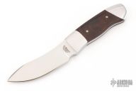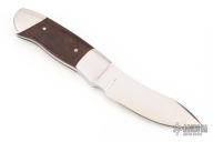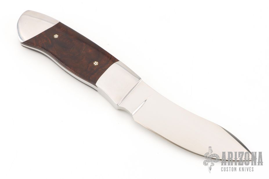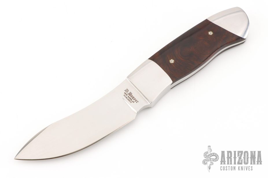 This Skinner by Devon Butch Beaver features mirror polished blade with .174" blade stock and 1.167" blade depth, full tapered tang construction. The handle has front/rear dovetailed stainless steel bolsters, burl wood scales with mosaic pins. Has a couple light scratches, otherwise excellent condition.