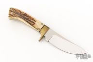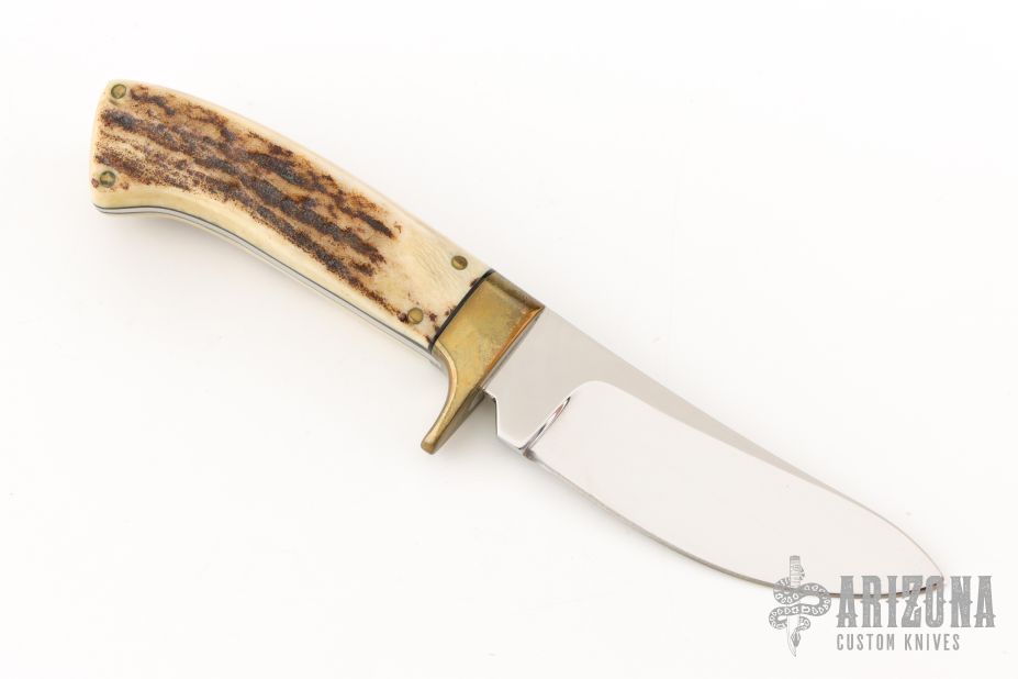 This Skinner by Devon Butch Beaver features mirror polished blade with .123" blade stock and .831" blade depth, full tapered tang construction. The handle has a brass guard and pinned stag grip. Comes in a zipper case. Has a couple light scratches and patina, otherwise excellent condition.