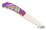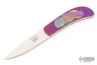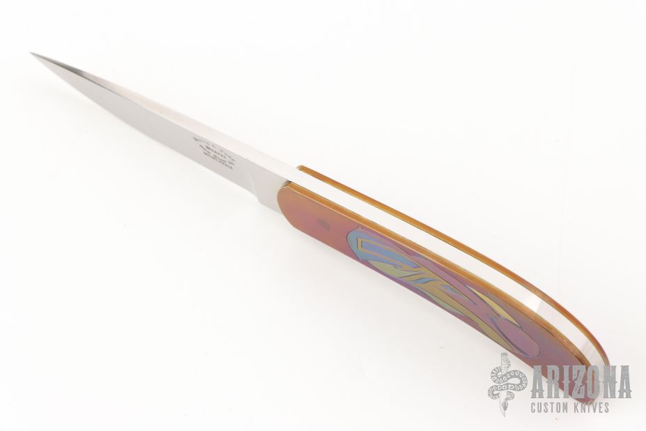 This Skinner by Devon Butch Beaver features a hand rub satin finished blade with .129" blade stock and .693" blade depth, full tang construction. The handle has anodized and engraved titanium covers. Comes in a zipper case. Has some scratches and patina. Good condition otherwise.