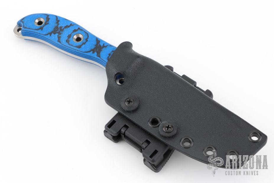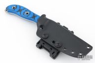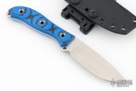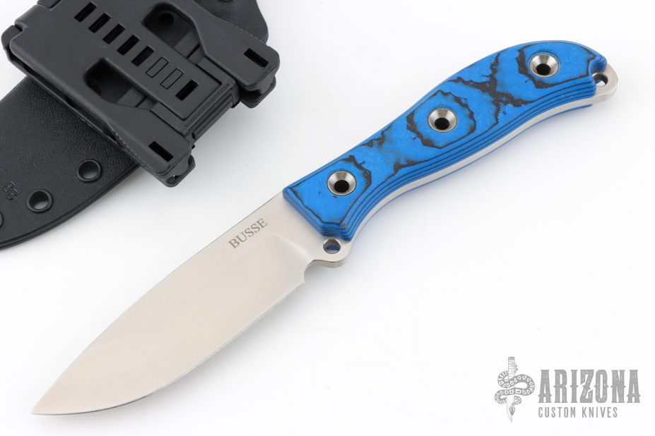 This RAD by the Busse features a satin finished drop point blade, .159" blade stock, 1.146" blade depth, full tang construction with black/blue G-10 scales and a lanyard hole. Comes in a Kydex sheath with clip. Excellent condition.