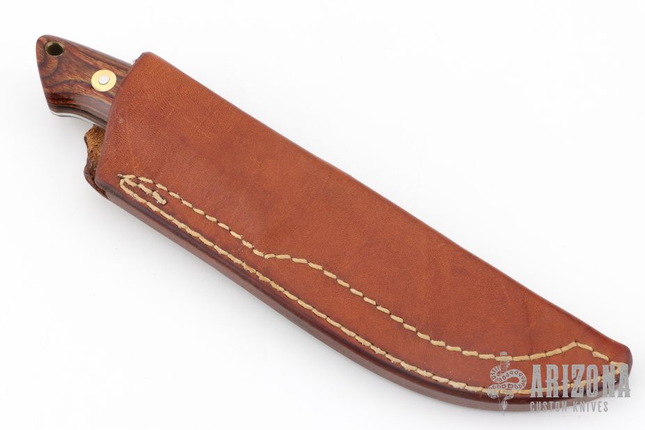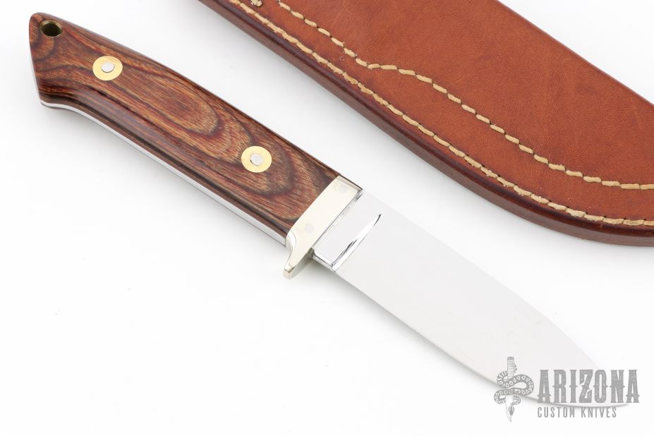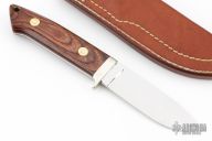 The classic Drop Point Hunter that made Bob Loveless designs so famous. Mirror finished drop point blade with the "R.W. Loveless maker Riverside, Calif." logo. Full tapered tang construction. .179" Blade Stock 1.033" Blade Depth. The handle has a nickel silver guard and laminated wood scales with red liners, lanyard hole. #1019. Comes with matching numbered leather sheath and a zippered case. Excellent condition. It is rare to see one in wood!