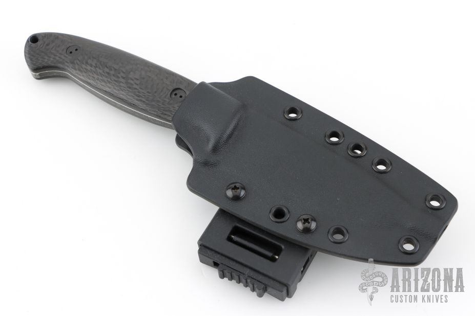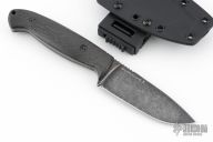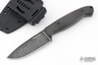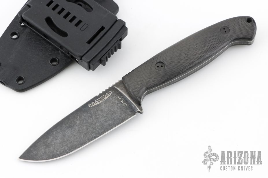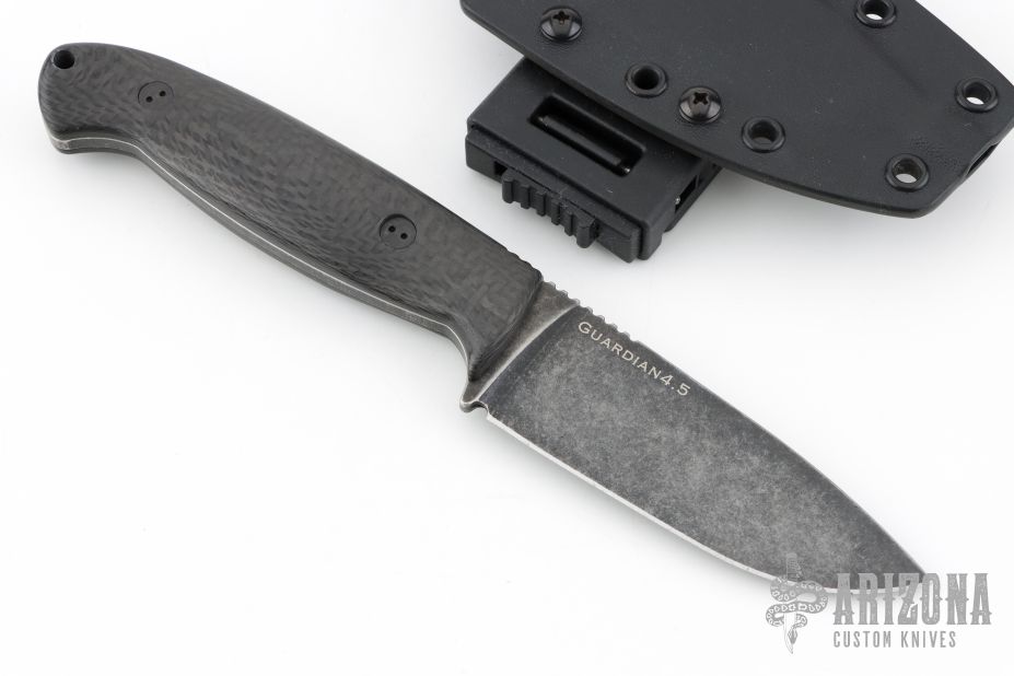 This Guardian 4.5 by Bradford Knives features a stonewashed finish drop point blade with notched thumbrest, .168" blade stock and 1.358" blade depth, full tang construction with contoured carbon fiber scales. Comes with kydex sheath and clip. Excellent condition.