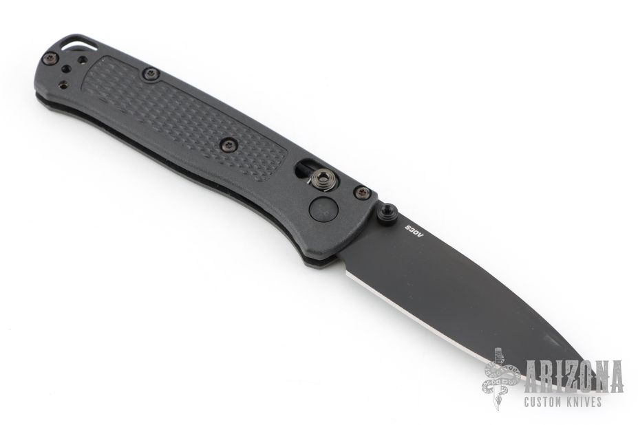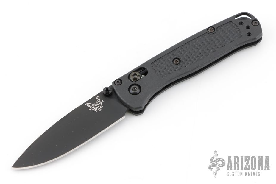 The Mini Bugout features a drop point blade with a flat dark Cerakote finish. It's a manual opener with ambidextrous thumb studs. This AXIS lock has a black CF-Elite frame and black hardware, a black mini deep-carry pocket clip, and a lanyard hole.  Includes original box, pouch and papers. Excellent Condition.