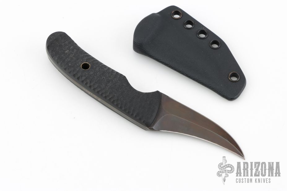 About the CT Model: Folders are great, but the fact is that they are nowhere near as quick and surefire to deploy as a fixed blade. The problem is carrying and concealing fixed blades. The CT is designed for front pocket carry or super discreet waist carry in non permissive environments. Toss this little guy in your front pocket or set up IWB, and you have a uber low profile, uber concealable, defensive tool. This CT is done up piksl style with a reverse edge knife meant to be held in the reverse (ice pick) grip. The technique involves kind of a 'stab and rip' movements. Joe ground this one with a dagger frind for twice the cutting power, and finished it with a patina'd finish. Textured black G10 handles scales with a brass bin. Molded kydex sheath ready for your preferred mounting solution.About Joe Watson: Joe Watson is like the stealth Bomber of the knife making world (back when it was classified). There tend to be knife collectors, and then knife users, and by users we mean guys doing serious stuff that train with a blade as a way of life. If you have heard of Joe Watson, they have probably come from these users. No flash, no hype. Just clean, purpose built, hand crafted defensive tools.